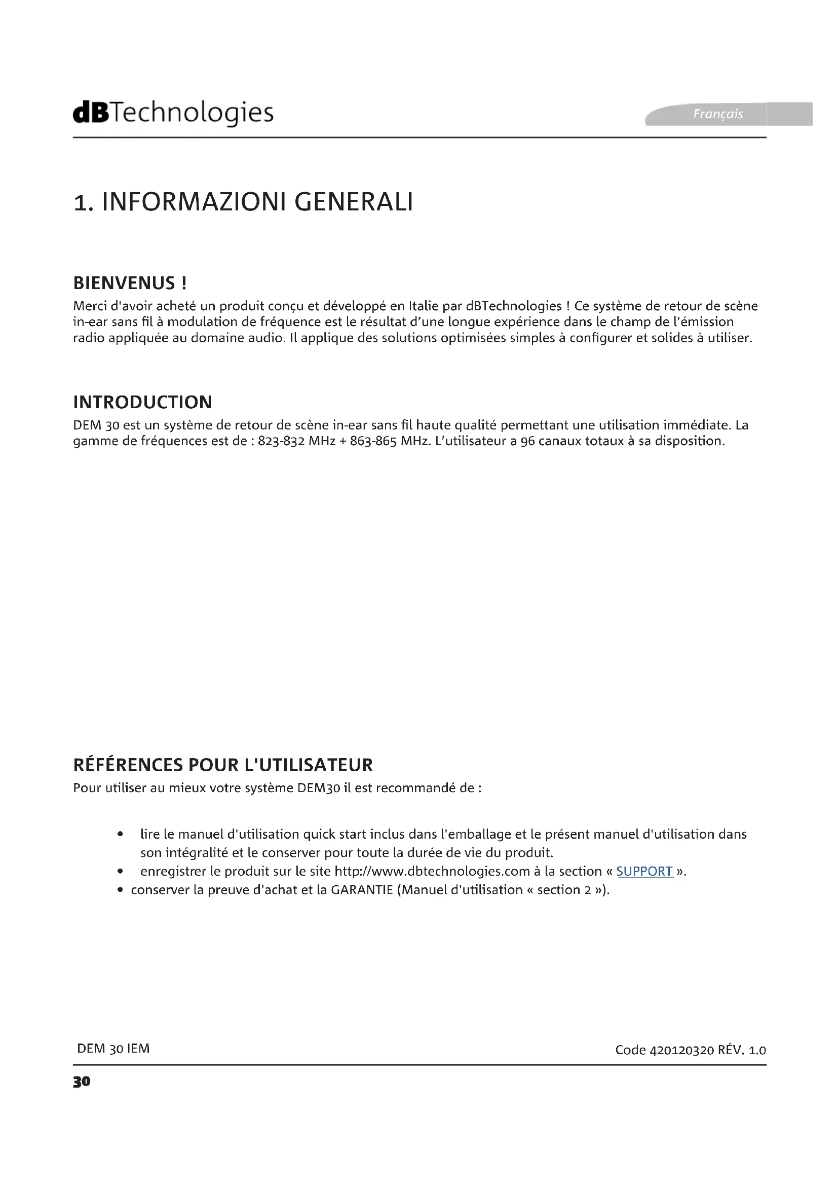 Merci d'avoir acheté un produit conçu et développé en Italie par dBTechnologies ! Ce système de retour de scène in-ear sans l à modulation de fréquence est le résultat d’une longue expérience dans le champ de l’émission radio appliquée au domaine audio. Il applique des solutions optimisées simples à congurer et solides à utiliser. DEM 30 est un système de retour de scène in-ear sans l haute qualité permettant une utilisation immédiate. La gamme de fréquences est de : 823-832 MHz + 863-865 MHz. L’utilisateur a 96 canaux totaux à sa disposition. Pour utiliser au mieux votre système DEM30 il est recommandé de :