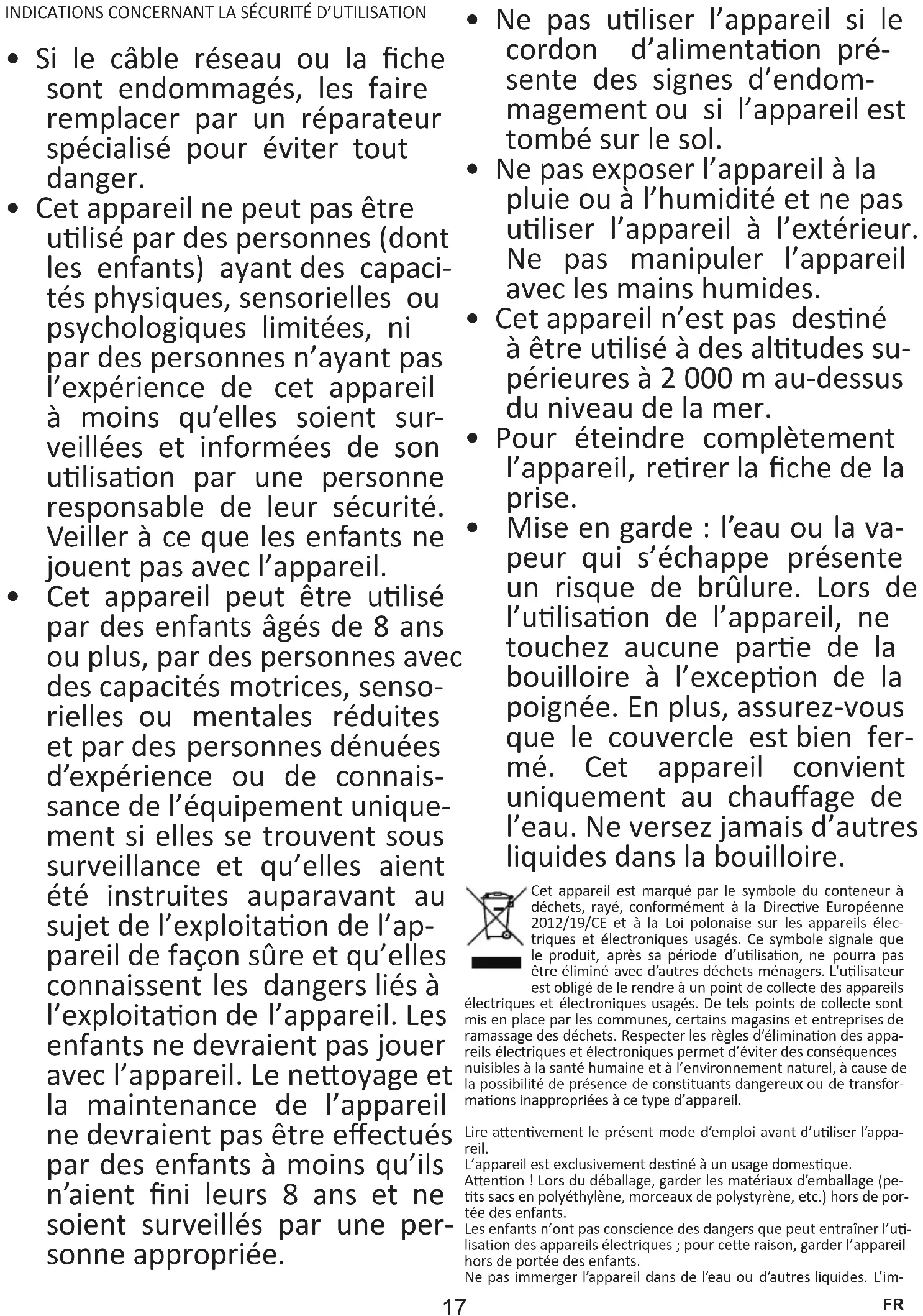 - Mise en garde : l’eau ou la va- peur qui s’échappe présente un risque de brûlure. Lors de l’ulisaon de l’appareil, ne touchez aucune pare de la bouilloire à l’excepon de la poignée. En plus, assurezvous que le couvercle est bien fer- mé. Cet appareil convient uniquement au chauage de l’eau. Ne versez jamais d’autres liquides dans la bouilloire. Cet appareil est marqué par le symbole du conteneur à déchets, rayé, conformément à la Direcve Européenne 2012/19/CE et à la Loi polonaise sur les appareils élec- triques et électroniques usagés. Ce symbole signale que le produit, après sa période d’ulisaon, ne pourra pas être éliminé avec d’autres déchets ménagers. L'ulisateur est obligé de le rendre à un point de collecte des appareils électriques et électroniques usagés. De tels points de collecte sont mis en place par les communes, certains magasins et entreprises de ramassage des déchets. Respecter les règles d’éliminaon des appa- reils électriques et électroniques permet d’éviter des conséquences nuisibles à la santé humaine et à l’environnement naturel, à cause de la possibilité de présence de constuants dangereux ou de transfor- maons inappropriées à ce type d’appareil. Lire aenvement le présent mode d’emploi avant d’uliser l’appa- reil. L’appareil est exclusivement desné à un usage domesque. Aenon ! Lors du déballage, garder les matériaux d’emballage (pe- ts sacs en polyéthylène, morceaux de polystyrène, etc.) hors de por- tée des enfants. Les enfants n’ont pas conscience des dangers que peut entraîner l’u- lisaon des appareils électriques ; pour cee raison, garder l’appareil hors de portée des enfants. Ne pas immerger l’appareil dans de l’eau ou d’autres liquides. L’im- FR18 mersion dans l’eau peut causer un choc électrique. En cas de déversement d’eau sur les éléments extérieurs de l’appareil, sécher soigneusement l’appareil avant de le brancher à l’alimentaon électrique. Ne pas toucher les surfaces mouillées au contact avec l’appareil branché à l’alimentaon électrique ; débrancher immédia- tement l’appareil de l’alimentaon électrique. En rerant la che de la prise murale, ne jamais rer sur le cordon, uniquement sur la che tout en tenant la prise secteur de l’autre main. Ne pas essayer de rerer des pièces du boîer. L’ulisaon d’accessoires qui n’ont pas été fournis avec le produit peut endommager l’appareil. Ne jamais placer l’appareil sur des surfaces chaudes. Ne pas placer le cordon d’alimentaon sur des arêtes vives ou à proxi- mité de surfaces chaudes. Avant d’insérer la che à la prise d’alimentaon assurezvous que vos mains sont sèches. La bouilloire est un appareil fabriqué en classe de protecon contre les chocs électriques I et, par conséquent, la prise de courant à la- quelle elle sera branchée doit être munie obligatoirement d’une bro- che de mise à la terre. Ne placer aucun objet à l’intérieur de l’appareil. Uliser uniquement de l’eau propre et remplir la bouilloire lentement un jet d'eau puissant provoquera des éclaboussures sur les côtés. Ne jamais remplir la bouilloire avec plus d’eau qu’indiqué par le re- père max. L’appareil génère des températures élevées. La bouilloire s’éteint automaquement lorsque l’eau bout. Il est pos- sible d’éteindre la bouilloire avant que l’eau ne bout à l’aide d’un inter- rupteur. Une fois que la bouilloire s’est éteinte automaquement (ou si elle a été éteinte manuellement), un certain temps (environ 15 à 20 secondes pour qu’elle refroidisse) peut s'écouler avant qu’elle puisse être remise en marche. La bouilloire ne peut être ulisée qu’avec la base fournie. Ne pas toucher la surface marquée de ce symbole pendant ou après le fonconnement de l’appareil. Ces surfaces sont chaudes. Débrancher la bouilloire et aendre qu’elle refroidisse avant de pro- céder à son neoyage. Lors de l’ébullion de l'eau, les pares de la bouilloire en acier inoxy- dable deviennent très chaudes. Ne pas mere en marche la bouilloire sans une quanté d’eau su- sante (repère « min » sur l’échelle). Ne pas laisser la bouilloire allumée sans surveillance ou lorsqu’elle n’a pas complètement refroidi. Uliser uniquement la poignée pour la manipulaon, les autres par- es externes peuvent être chaudes. Placer l’appareil sur une surface plane et stable pendant le foncon- nement. Vérier si la tension indiquée sur la plaque signaléque correspond aux paramètres de l’alimentaon électrique à la maison, tout en s’as- surant que cee alimentaon est marquée par ~ (courant alternaf). L’appareil est desné à être ulisé à domicile ou dans des lieux tels que : la cuisine pour les employés ; les bouques, les bureaux et autres environnements de travail, ulisaon par les clients d’hôtels, de motels et d’autres lieux d’habitaon, de bâments habitables ru- raux, d’édices d’hébergement ; DONNÉES TECHNIQUES : Paramètres d’alimentaon : AC 220240 V / 5060 Hz Puissance : 18502200 W Capacité : 1,5 l PANNEAU DE COMMANDE :