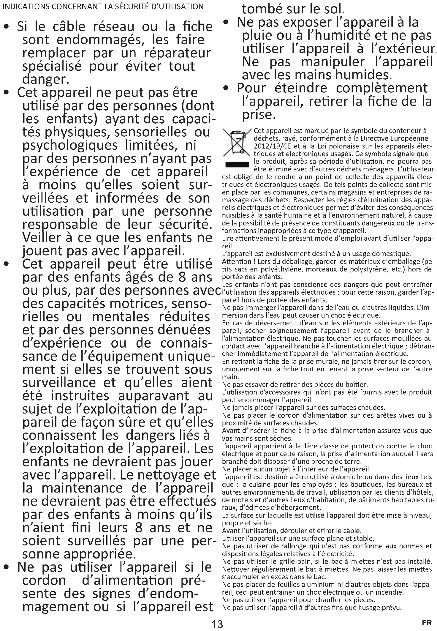 - Pour éteindre complètement l’appareil, rerer la che de la prise. Cet appareil est marqué par le symbole du conteneur à déchets, rayé, conformément à la Direcve Européenne 2012/19/CE et à la Loi polonaise sur les appareils élec- triques et électroniques usagés. Ce symbole signale que le produit, après sa période d’ulisaon, ne pourra pas être éliminé avec d’autres déchets ménagers. L'ulisateur est obligé de le rendre à un point de collecte des appareils élec- triques et électroniques usagés. De tels points de collecte sont mis en place par les communes, certains magasins et entreprises de ra- massage des déchets. Respecter les règles d’éliminaon des appa- reils électriques et électroniques permet d’éviter des conséquences nuisibles à la santé humaine et à l’environnement naturel, à cause de la possibilité de présence de constuants dangereux ou de trans- formaons inappropriées à ce type d’appareil. Lire aenvement le présent mode d’emploi avant d’uliser l’appa- reil. L’appareil est exclusivement desné à un usage domesque. Aenon ! Lors du déballage, garder les matériaux d’emballage (pe- ts sacs en polyéthylène, morceaux de polystyrène, etc.) hors de portée des enfants. Les enfants n’ont pas conscience des dangers que peut entraîner l’ulisaon des appareils électriques ; pour cee raison, garder l’ap- pareil hors de portée des enfants. Ne pas immerger l’appareil dans de l’eau ou d’autres liquides. L’im- mersion dans l’eau peut causer un choc électrique. En cas de déversement d’eau sur les éléments extérieurs de l’ap- pareil, sécher soigneusement l’appareil avant de le brancher à l’alimentaon électrique. Ne pas toucher les surfaces mouillées au contact avec l’appareil branché à l’alimentaon électrique ; débran- cher immédiatement l’appareil de l’alimentaon électrique. En rerant la che de la prise murale, ne jamais rer sur le cordon, uniquement sur la che tout en tenant la prise secteur de l’autre main. Ne pas essayer de rerer des pièces du boîer. L’ulisaon d’accessoires qui n’ont pas été fournis avec le produit peut endommager l’appareil. Ne jamais placer l’appareil sur des surfaces chaudes. Ne pas placer le cordon d’alimentaon sur des arêtes vives ou à proximité de surfaces chaudes. Avant d’insérer la che à la prise d’alimentaon assurezvous que vos mains sont sèches. L’appareil apparent à la 1ère classe de protecon contre le choc électrique et pour cee raison, la prise d’alimentaon auquel il sera branché doit disposer d’une broche de terre. Ne placer aucun objet à l’intérieur de l’appareil. L’appareil est desné à être ulisé à domicile ou dans des lieux tels que : la cuisine pour les employés ; les bouques, les bureaux et autres environnements de travail, ulisaon par les clients d’hôtels, de motels et d’autres lieux d’habitaon, de bâments habitables ru- raux, d’édices d’hébergement. La surface sur laquelle est ulisé l’appareil doit être mise à niveau, propre et sèche. Avant l’ulisaon, dérouler et érer le câble. Uliser l’appareil sur une surface plane et stable. Ne pas uliser de rallonge qui n’est pas conforme aux normes et disposions légales relaves à l’électricité. Ne pas uliser le grillepain, si le bac à miees n’est pas installé. Neoyer régulièrement le bac à miees. Ne pas laisser les miees s’accumuler en excès dans le bac. Ne pas placer de feuilles aluminium ni d’autres objets dans l’appa- reil, ceci peut entrainer un choc électrique ou un incendie. Ne pas uliser l’appareil pour chauer les pièces. Ne pas uliser l’appareil à d’autres ns que l’usage prévu.14