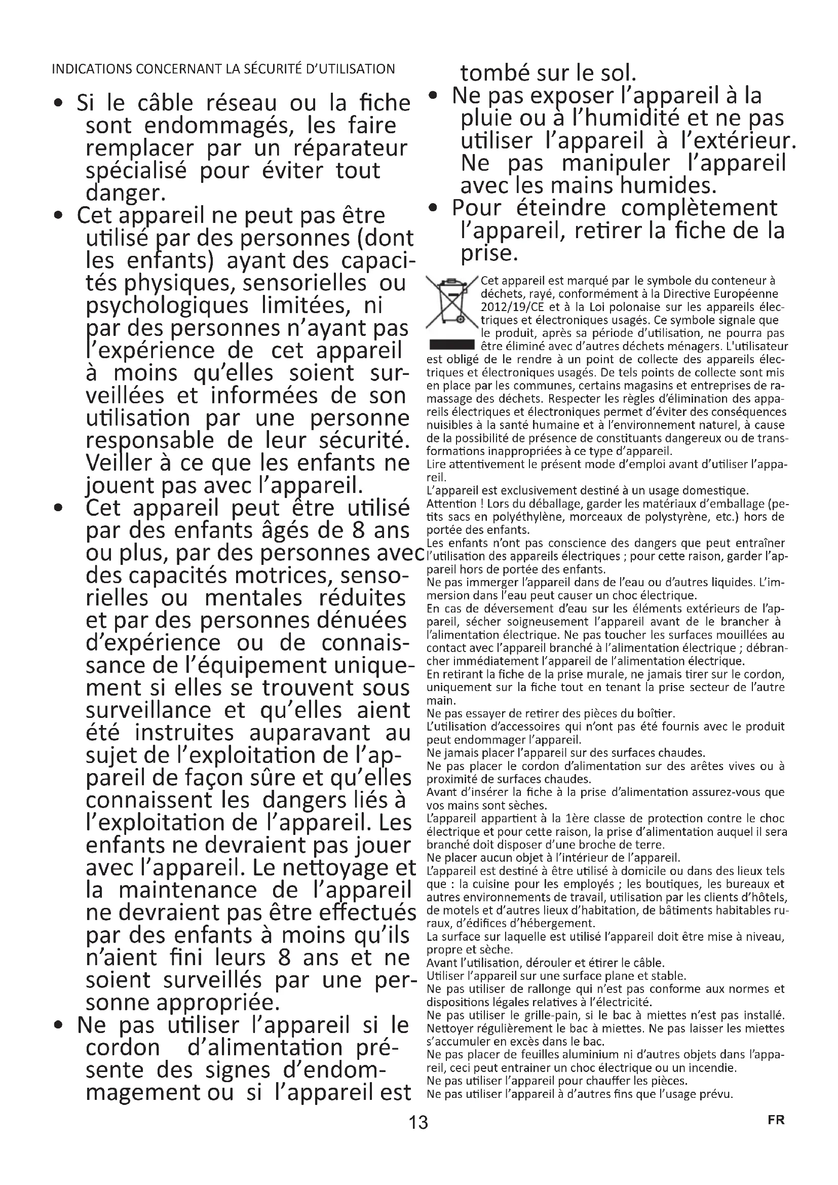 - Pour éteindre complètement l’appareil, rerer la che de la prise. Cet appareil est marqué par le symbole du conteneur à déchets, rayé, conformément à la Direcve Européenne 2012/19/CE et à la Loi polonaise sur les appareils élec- triques et électroniques usagés. Ce symbole signale que le produit, après sa période d’ulisaon, ne pourra pas être éliminé avec d’autres déchets ménagers. L'ulisateur est obligé de le rendre à un point de collecte des appareils élec- triques et électroniques usagés. De tels points de collecte sont mis en place par les communes, certains magasins et entreprises de ra- massage des déchets. Respecter les règles d’éliminaon des appa- reils électriques et électroniques permet d’éviter des conséquences nuisibles à la santé humaine et à l’environnement naturel, à cause de la possibilité de présence de constuants dangereux ou de trans- formaons inappropriées à ce type d’appareil. Lire aenvement le présent mode d’emploi avant d’uliser l’appa- reil. L’appareil est exclusivement desné à un usage domesque. Aenon ! Lors du déballage, garder les matériaux d’emballage (pe- ts sacs en polyéthylène, morceaux de polystyrène, etc.) hors de portée des enfants. Les enfants n’ont pas conscience des dangers que peut entraîner l’ulisaon des appareils électriques ; pour cee raison, garder l’ap- pareil hors de portée des enfants. Ne pas immerger l’appareil dans de l’eau ou d’autres liquides. L’im- mersion dans l’eau peut causer un choc électrique. En cas de déversement d’eau sur les éléments extérieurs de l’ap- pareil, sécher soigneusement l’appareil avant de le brancher à l’alimentaon électrique. Ne pas toucher les surfaces mouillées au contact avec l’appareil branché à l’alimentaon électrique ; débran- cher immédiatement l’appareil de l’alimentaon électrique. En rerant la che de la prise murale, ne jamais rer sur le cordon, uniquement sur la che tout en tenant la prise secteur de l’autre main. Ne pas essayer de rerer des pièces du boîer. L’ulisaon d’accessoires qui n’ont pas été fournis avec le produit peut endommager l’appareil. Ne jamais placer l’appareil sur des surfaces chaudes. Ne pas placer le cordon d’alimentaon sur des arêtes vives ou à proximité de surfaces chaudes. Avant d’insérer la che à la prise d’alimentaon assurezvous que vos mains sont sèches. L’appareil apparent à la 1ère classe de protecon contre le choc électrique et pour cee raison, la prise d’alimentaon auquel il sera branché doit disposer d’une broche de terre. Ne placer aucun objet à l’intérieur de l’appareil. L’appareil est desné à être ulisé à domicile ou dans des lieux tels que : la cuisine pour les employés ; les bouques, les bureaux et autres environnements de travail, ulisaon par les clients d’hôtels, de motels et d’autres lieux d’habitaon, de bâments habitables ru- raux, d’édices d’hébergement. La surface sur laquelle est ulisé l’appareil doit être mise à niveau, propre et sèche. Avant l’ulisaon, dérouler et érer le câble. Uliser l’appareil sur une surface plane et stable. Ne pas uliser de rallonge qui n’est pas conforme aux normes et disposions légales relaves à l’électricité. Ne pas uliser le grillepain, si le bac à miees n’est pas installé. Neoyer régulièrement le bac à miees. Ne pas laisser les miees s’accumuler en excès dans le bac. Ne pas placer de feuilles aluminium ni d’autres objets dans l’appa- reil, ceci peut entrainer un choc électrique ou un incendie. Ne pas uliser l’appareil pour chauer les pièces. Ne pas uliser l’appareil à d’autres ns que l’usage prévu.14