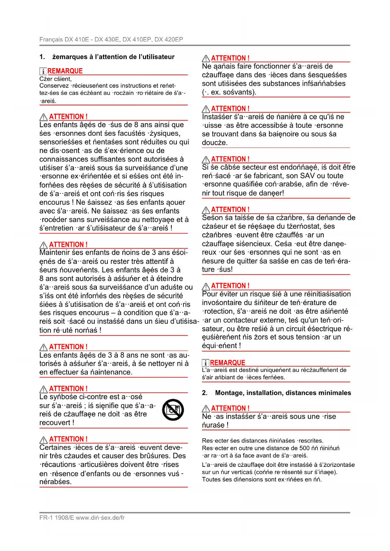 ATTENTION ! Ne pas installer l’appareil sous une prise murale ! Respecter les distances minimales prescrites. Respecter en outre une distance de 500 mm minimum par rapport à la face avant de l'appareil. L’appareil de chauffage doit être installé à l’horizontale sur un mur vertical (comme représenté sur l’image). Toutes les dimensions sont exprimées en mm.www.dimplex.de/fr 1908/E FR-2 DX 410E - DX 430E, DX 410EP, DX 420EP Français Lors du montage, il convient de respecter scrupuleuse- ment les prescriptions d’installation en vigueur concer- nant la zone de protection. Le raccordement secteur doit être accessible après le montage. Veiller à ce que l’air puisse entrer et sortir librement au- dessus et en dessous de l’appareil de chauffage