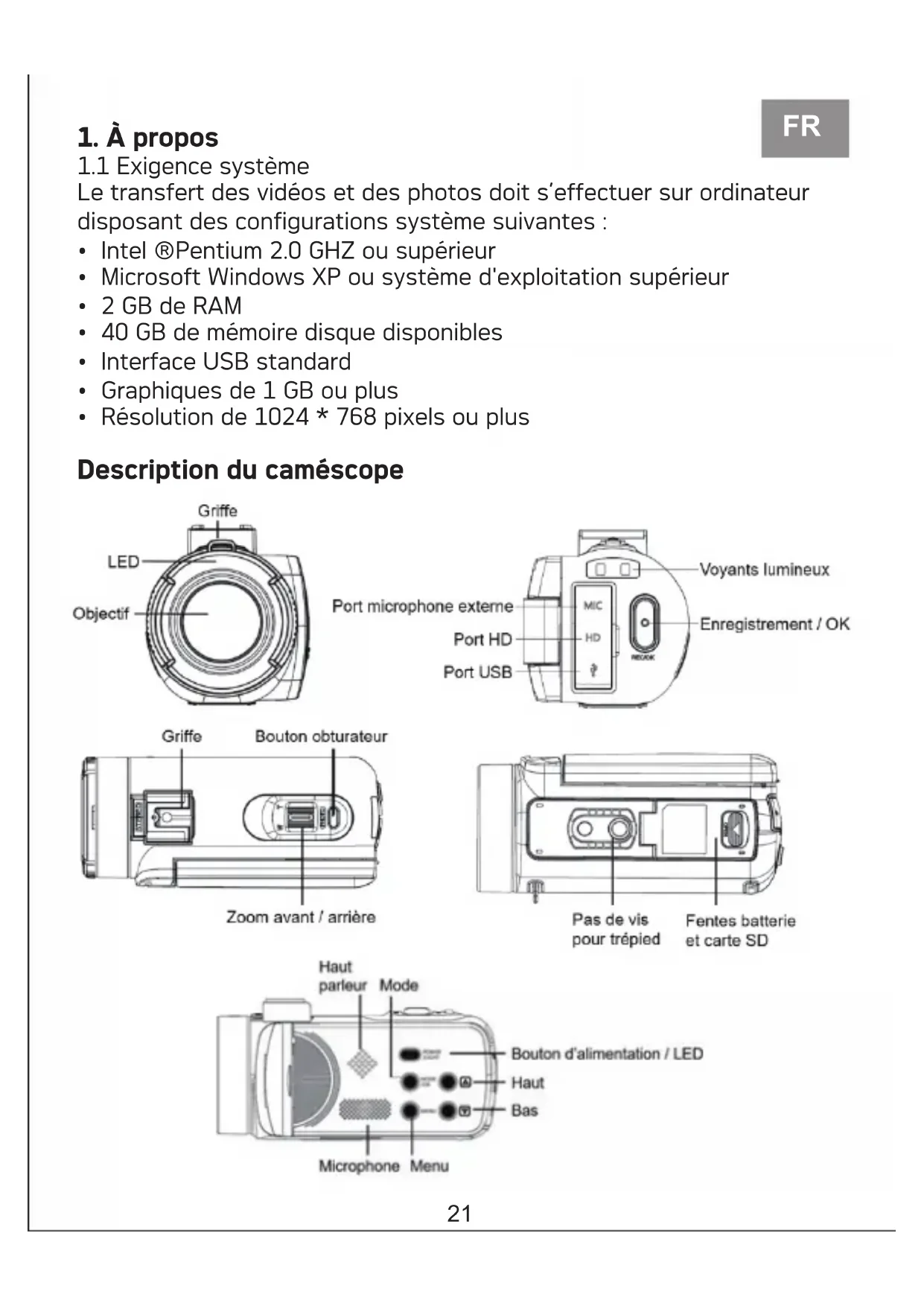 - Résolution de 1024 * 768 pixels ou plus Description du caméscope