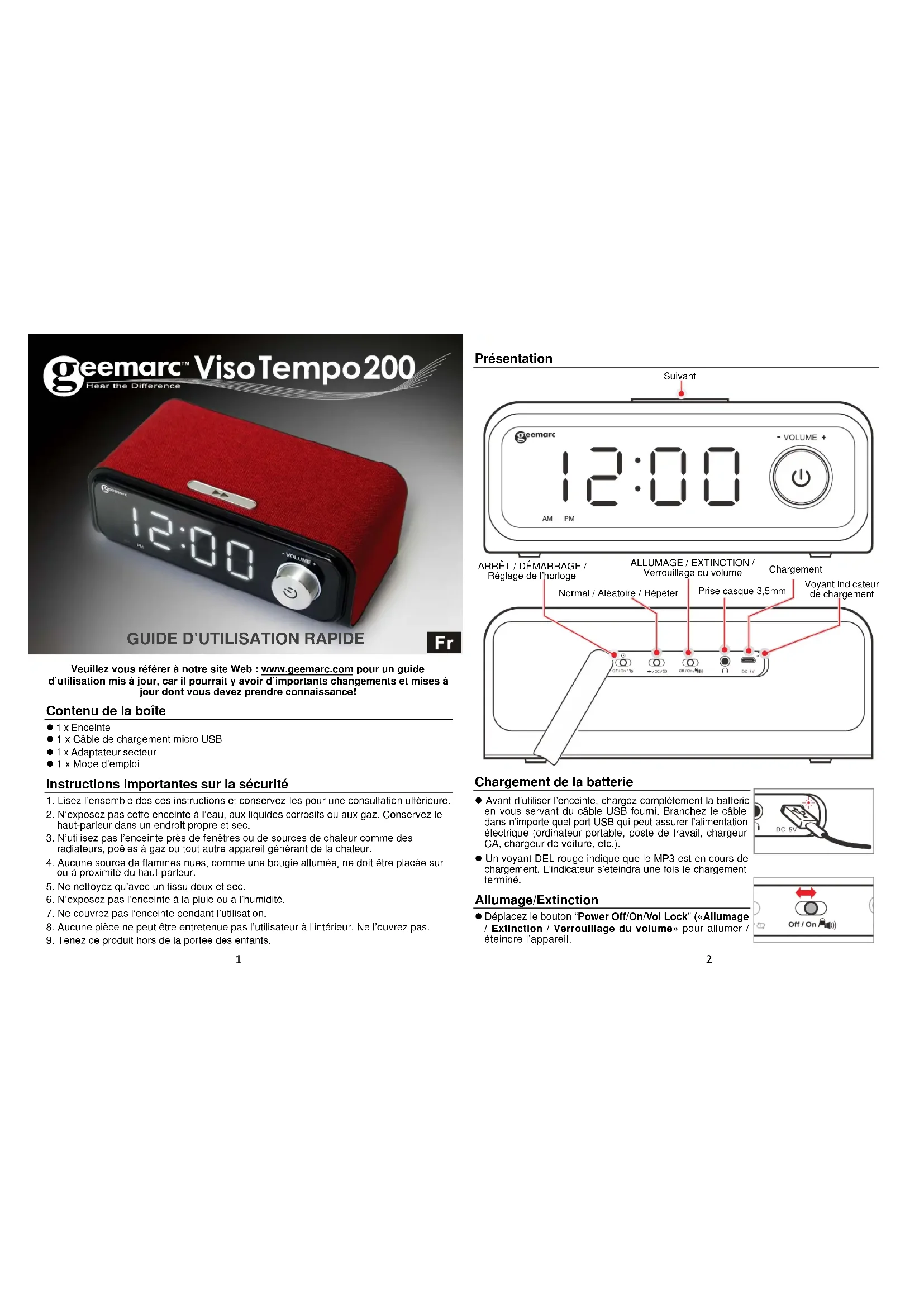 Veuillez vous référer à notre site Web : www.geemarc.com pour un guide d’utilisation mis à jour, car il pourrait y avoir d’importants changements et mises à jour dont vous devez prendre connaissance! Contenu de la boîte z 1 x Enceinte z 1 x Câble de chargement micro USB z 1 x Adaptateur secteur z 1 x Mode d’emploi Instructions importantes sur la sécurité