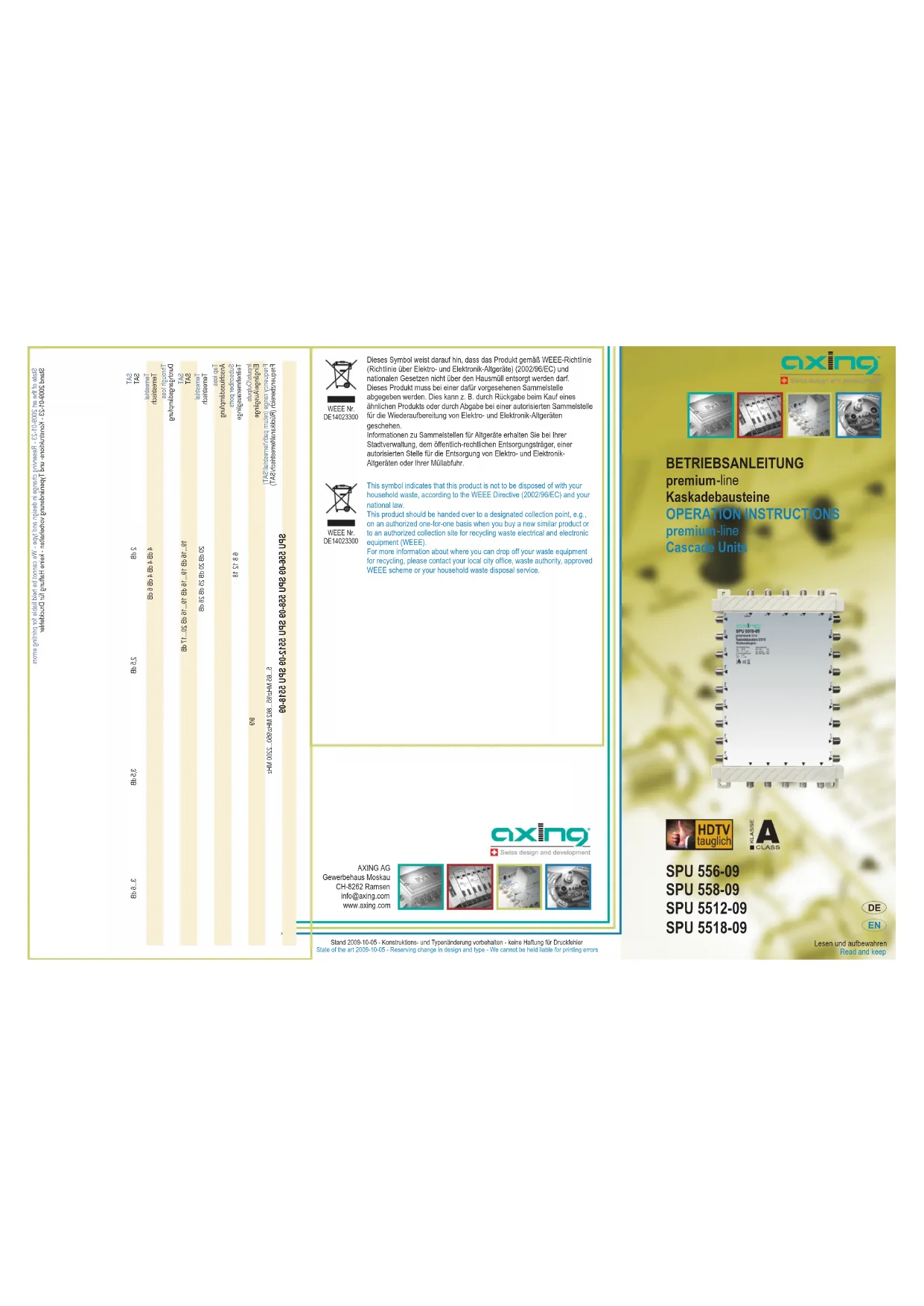 - dBAtténuation de passageDoorgangsdempingTerrestreTerrestrisch4 dB 4 dB 4 dB 6 dB SAT SAT 2 dB 2,5 dB 3,5 dB 3 dB Etat actuel 2009-01-23 - Sous réserve de modifications de construction et de type. Nous n assumons aucune responsabilité pour les erreurs d'impression Stand 2009-01-23 - constructie- en typewijziging voorbehouden - geen aansprakelijkheid voor drukfoutenDomaine d'application : Connexion HF : Les appareils conviennent exclusivement à l'amplification ainsi qu'à la distribution de signaux de radio et de télévision dans la maison ! Il ne sera accordé aucune garantie si l'appareil fait l'objet d'une utilisation autre que celle indiquée ! 4 niveaux de polarisation SAT-fréquence intermédiaire, les signaux terrestres (par ex. radio à ondes ultracourtes) inclus, peuvent être répartis sur plusieurs récepteurs SAT à l'aide des unités en cascade. SPU 556-09 = 6 récepteurs, SPU 558-09 = 8 récepteurs, SPU 5512-09 = 12 récepteurs et SPU 5518-09 = 18 récepteurs. Pour un système en cascade avec des unités en cascade SPU 556-09, SPU 558-09, SPU 5512-09 ou SPU 5518-09, vous avez besoin d'un commutateur de polarité SPU 56-09, 510-09 ou 516-09. Respectez lors de la mise en service du commutateur de polarité le mode d'emploi. Connectez les sorties du commutateur de polarité aux entrées des unités en cascade. Utilisez pour cela l'adaptateur F/F-Quickfix CFA 4-01 (ne fait pas partie de la livraison) afin de connecter facilement les appareils les uns aux autres (1) à (3). Si vous utilisez plusieurs unités en cascade, connectez les sorties de l'unité en cascade aux entrées d'une autre unité cascade etc. Remarque : En fonction de la structure de l'installation (pertes de niveau), d'autres commutateurs de polarité sont nécessaires pour intensifier les signaux de passage en cas d'utilisation de plusieurs unités en cascade (4). Charger les sorties de la dernière unité en cascade à l'aide des résistances de charge CFA 11-00 fournies. Connectez les sorties latérales pour participants à l'aide des prises antennes. Utilisez pour tous les raccordements HF des câbles coaxiaux hautement blindés avec fiches de raccordement F. Vous trouverez des câbles et fiches appropriés dans le catalogue AXING actuel ou sous www.axing.comRemarque : p. 6