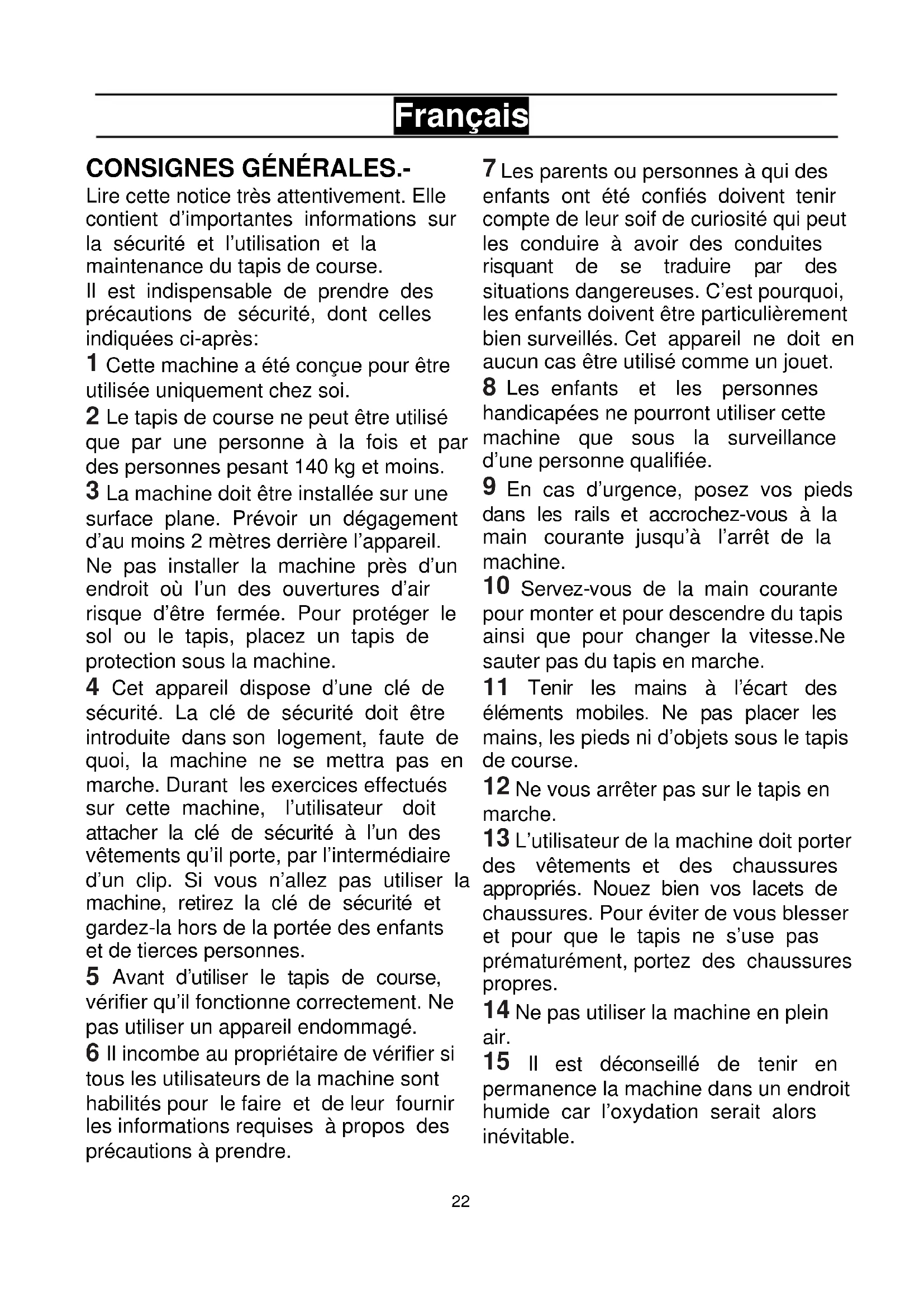 Lire cette notice très attentivement. Elle contient d’importantes informations sur la sécurité et l’utilisation et la maintenance du tapis de course. Il est indispensable de prendre des précautions de sécurité, dont celles indiquées ci-après: