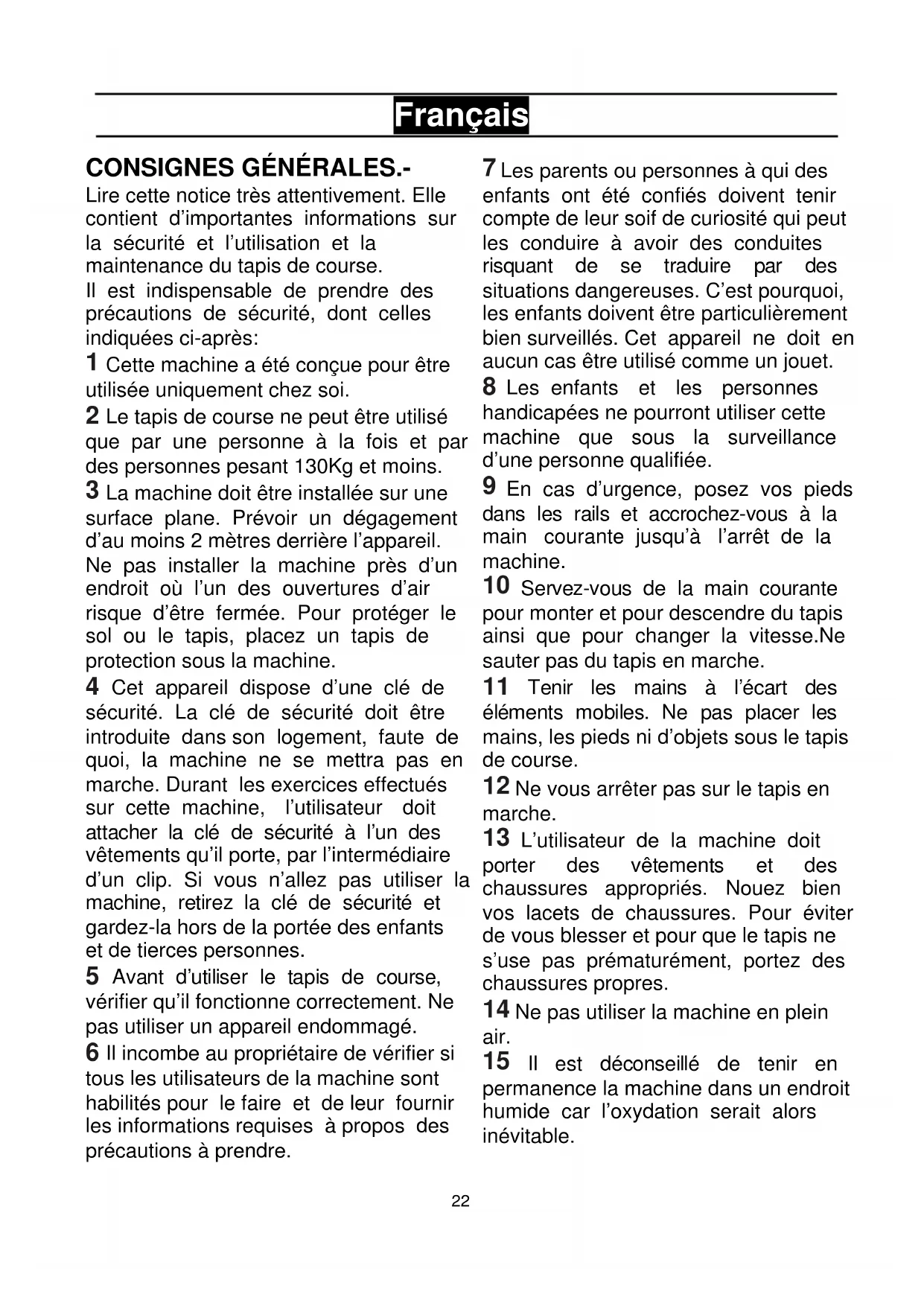 Lire cette notice très attentivement. Elle contient d’importantes informations sur la sécurité et l’utilisation et la maintenance du tapis de course. Il est indispensable de prendre des précautions de sécurité, dont celles indiquées ci-après: