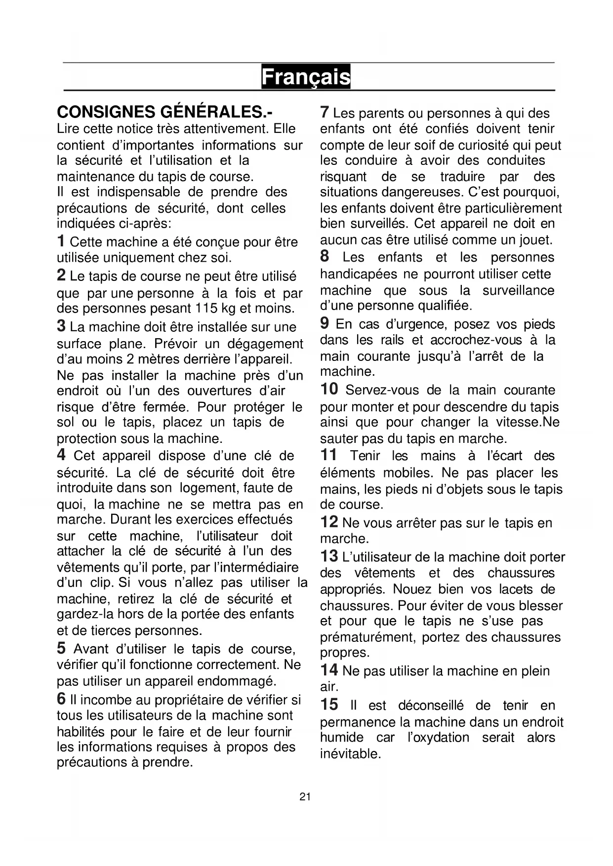 Lire cette notice très attentivement. Elle contient d’importantes informations sur la sécurité et l’utilisation et la maintenance du tapis de course. Il est indispensable de prendre des précautions de sécurité, dont celles indiquées ci-après: 1 Cette machine a été conçue pour être utilisée uniquement chez soi. 2 Le tapis de course ne peut être utilisé que par une personne à la fois et par des personnes pesant 115 kg et moins. 3 La machine doit être installée sur une surface plane. Prévoir un dégagement d’au moins 2 mètres derrière l’appareil. Ne pas installer la machine près d’un endroit où l’un des ouvertures d’air risque d’être fermée. Pour protéger le sol ou le tapis, placez un tapis de protection sous la machine. 4 Cet appareil dispose d’une clé de sécurité. La clé de sécurité doit être introduite dans son logement, faute de quoi, la machine ne se mettra pas en marche. Durant les exercices effectués sur cette machine, l’utilisateur doit attacher la clé de sécurité à l’un des vêtements qu’il porte, par l’intermédiaire d’un clip. Si vous n’allez pas utiliser la machine, retirez la clé de sécurité et gardez-la hors de la portée des enfants et de tierces personnes. 5 Avant d’utiliser le tapis de course, vérifier qu’il fonctionne correctement. Ne pas utiliser un appareil endommagé. 6 Il incombe au propriétaire de vérifier si tous les utilisateurs de la machine sont habilités pour le faire et de leur fournir les informations requises à propos des précautions à prendre. 7 Les parents ou personnes à qui des enfants ont été confiés doivent tenir compte de leur soif de curiosité qui peut les conduire à avoir des conduites risquant de se traduire par des situations dangereuses. C’est pourquoi, les enfants doivent être particulièrement bien surveillés. Cet appareil ne doit en aucun cas être utilisé comme un jouet. 8 Les enfants et les personnes handicapées ne pourront utiliser cette machine que sous la surveillance d’une personne qualifiée. 9 En cas d’urgence, posez vos pieds dans les rails et accrochez-vous à la main courante jusqu’à l’arrêt de la machine. 10 Servez-vous de la main courante pour monter et pour descendre du tapis ainsi que pour changer la vitesse.Ne sauter pas du tapis en marche. 11 Tenir les mains à l’écart des éléments mobiles. Ne pas placer les mains, les pieds ni d’objets sous le tapis de course. 12 Ne vous arrêter pas sur le tapis en marche. 13 L’utilisateur de la machine doit porter des vêtements et des chaussures appropriés. Nouez bien vos lacets de chaussures. Pour éviter de vous blesser et pour que le tapis ne s’use pas prématurément, portez des chaussures propres. 14 Ne pas utiliser la machine en plein air. 15 Il est déconseillé de tenir en permanence la machine dans un endroit humide car l’oxydation serait alors inévitable.22 16 Veillez à ne pas graisser la machine exagérément car vous risquez de tacher le sol ou les tapis sur lesquels repose la machine. 17 Ne pas utiliser d’accessoires autres que ceux recommandés par le fabricant.