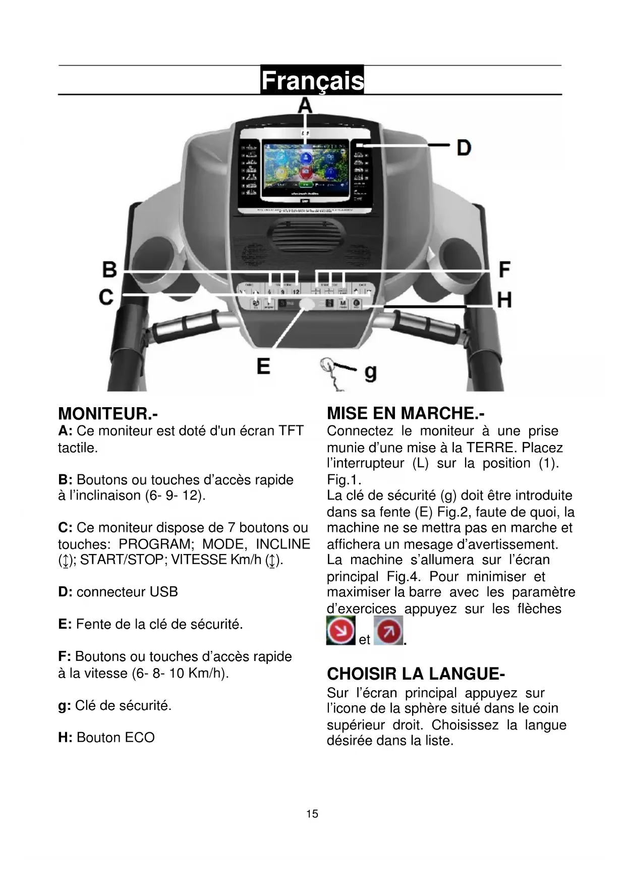 MONITEUR.- A: Ce moniteur est doté d'un écran TFT tactile. B: Boutons ou touches d’accès rapide à l’inclinaison (6- 9- 12). C: Ce moniteur dispose de 7 boutons ou touches: PROGRAM; MODE, INCLINE (↨); START/STOP; VITESSE Km/h (↨). D: connecteur USB E: Fente de la clé de sécurité. F: Boutons ou touches d’accès rapide à la vitesse (6- 8- 10 Km/h). g: Clé de sécurité. H: Bouton ECO