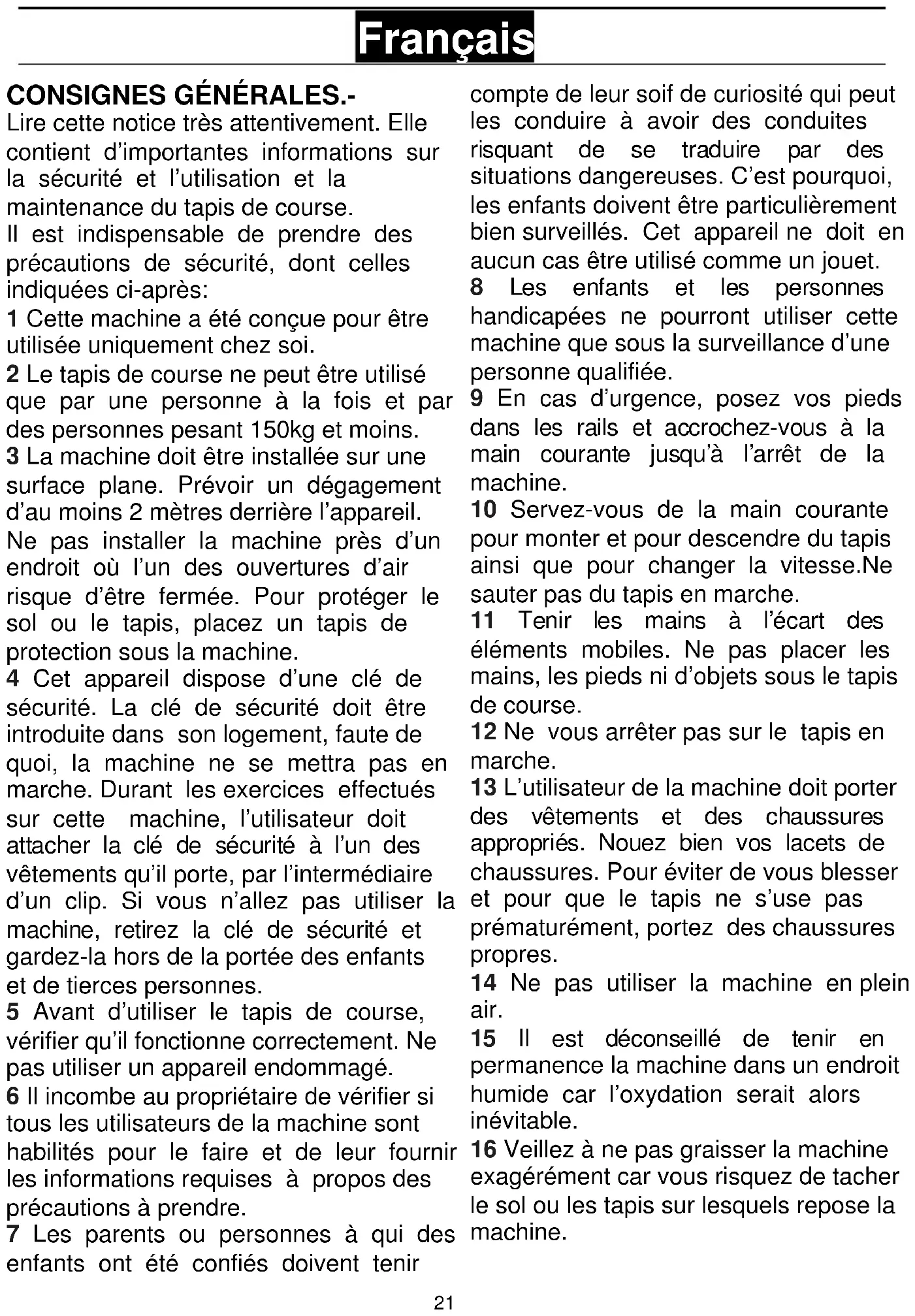 Lire cette notice très attentivement. Elle contient d’importantes informations sur la sécurité et l’utilisation et la maintenance du tapis de course. Il est indispensable de prendre des précautions de sécurité, dont celles indiquées ci-après: 1 Cette machine a été conçue pour être utilisée uniquement chez soi. 2 Le tapis de course ne peut être utilisé que par une personne à la fois et par des personnes pesant 150kg et moins. 3 La machine doit être installée sur une surface plane. Prévoir un dégagement d’au moins 2 mètres derrière l’appareil. Ne pas installer la machine près d’un endroit où l’un des ouvertures d’air risque d’être fermée. Pour protéger le sol ou le tapis, placez un tapis de protection sous la machine. 4 Cet appareil dispose d’une clé de sécurité. La clé de sécurité doit être introduite dans son logement, faute de quoi, la machine ne se mettra pas en marche. Durant les exercices effectués sur cette machine, l’utilisateur doit attacher la clé de sécurité à l’un des vêtements qu’il porte, par l’intermédiaire d’un clip. Si vous n’allez pas utiliser la machine, retirez la clé de sécurité et gardez-la hors de la portée des enfants et de tierces personnes. 5 Avant d’utiliser le tapis de course, vérifier qu’il fonctionne correctement. Ne pas utiliser un appareil endommagé. 6 Il incombe au propriétaire de vérifier si tous les utilisateurs de la machine sont habilités pour le faire et de leur fournir les informations requises à propos des précautions à prendre. 7 Les parents ou personnes à qui des enfants ont été confiés doivent tenir compte de leur soif de curiosité qui peut les conduire à avoir des conduites risquant de se traduire par des situations dangereuses. C’est pourquoi, les enfants doivent être particulièrement bien surveillés. Cet appareil ne doit en aucun cas être utilisé comme un jouet. 8 Les enfants et les personnes handicapées ne pourront utiliser cette machine que sous la surveillance d’une personne qualifiée. 9 En cas d’urgence, posez vos pieds dans les rails et accrochez-vous à la main courante jusqu’à l’arrêt de la machine. 10 Servez-vous de la main courante pour monter et pour descendre du tapis ainsi que pour changer la vitesse.Ne sauter pas du tapis en marche. 11 Tenir les mains à l’écart des éléments mobiles. Ne pas placer les mains, les pieds ni d’objets sous le tapis de course. 12 Ne vous arrêter pas sur le tapis en marche. 13 L’utilisateur de la machine doit porter des vêtements et des chaussures appropriés. Nouez bien vos lacets de chaussures. Pour éviter de vous blesser et pour que le tapis ne s’use pas prématurément, portez des chaussures propres. 14 Ne pas utiliser la machine en plein air. 15 Il est déconseillé de tenir en permanence la machine dans un endroit humide car l’oxydation serait alors inévitable. 16 Veillez à ne pas graisser la machine exagérément car vous risquez de tacher le sol ou les tapis sur lesquels repose la machine.22