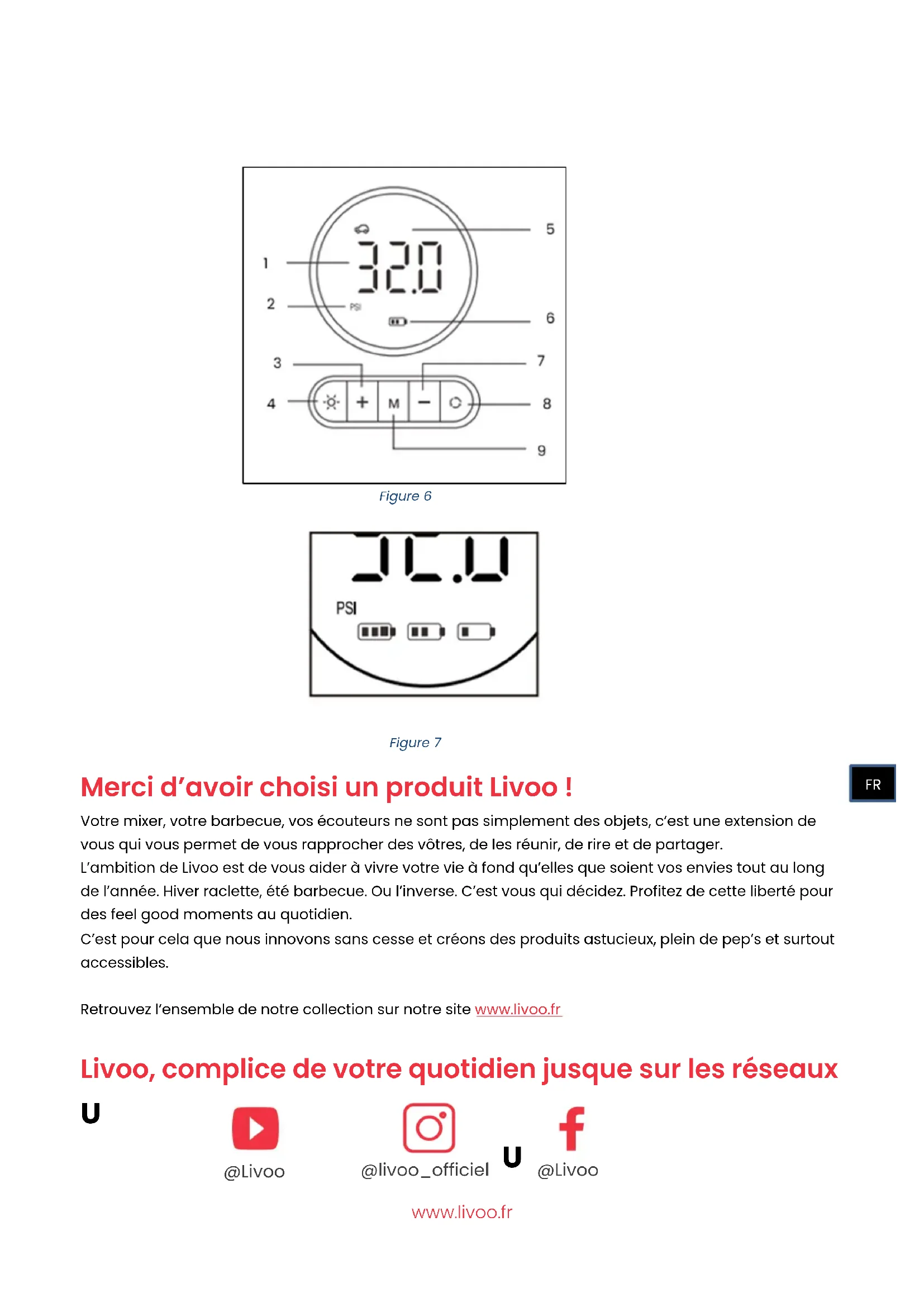 Figure 6www.livoo.fr Consigne de sécurité Merci de lire les instructions ci-dessous avec attention avant d’utiliser l’appareil et de les conserver pour un usage ultérieur. Une mauvaise utilisation de l'appareil peut l'endommager ou blesser l'utilisateur. Assurez-vous que vous utilisez l'appareil dans le but pour lequel il est conçu. Nous refusons toutes responsabilités quant aux dégâts (aux dommages et intérêts) dus à une utilisation incorrecte ou une mauvaise manipulation.