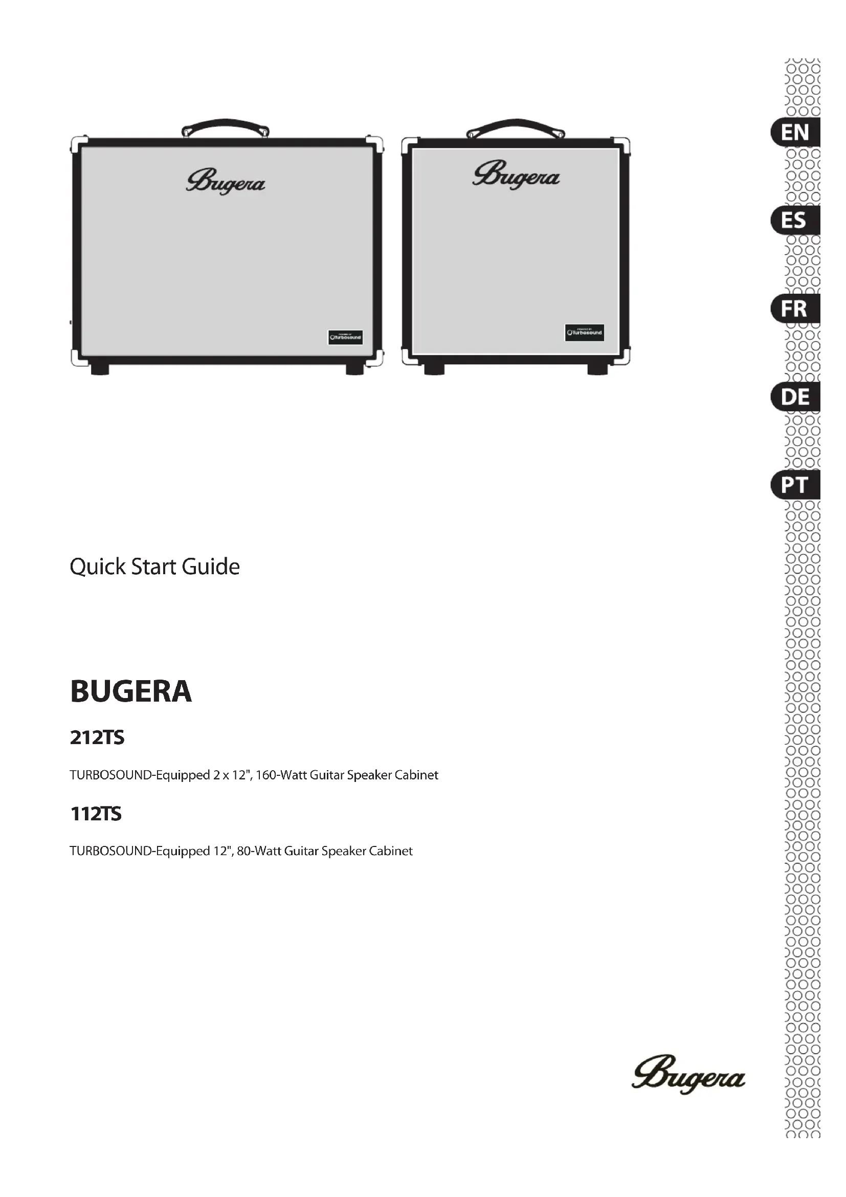 Téléchargez la notice de votre Guitare au format PDF gratuitement ! Retrouvez votre notice 112TS - Bugera et reprennez votre appareil électronique en main. Sur cette page sont publiés tous les documents nécessaires à l'utilisation de votre appareil 112TS de la marque Bugera.
