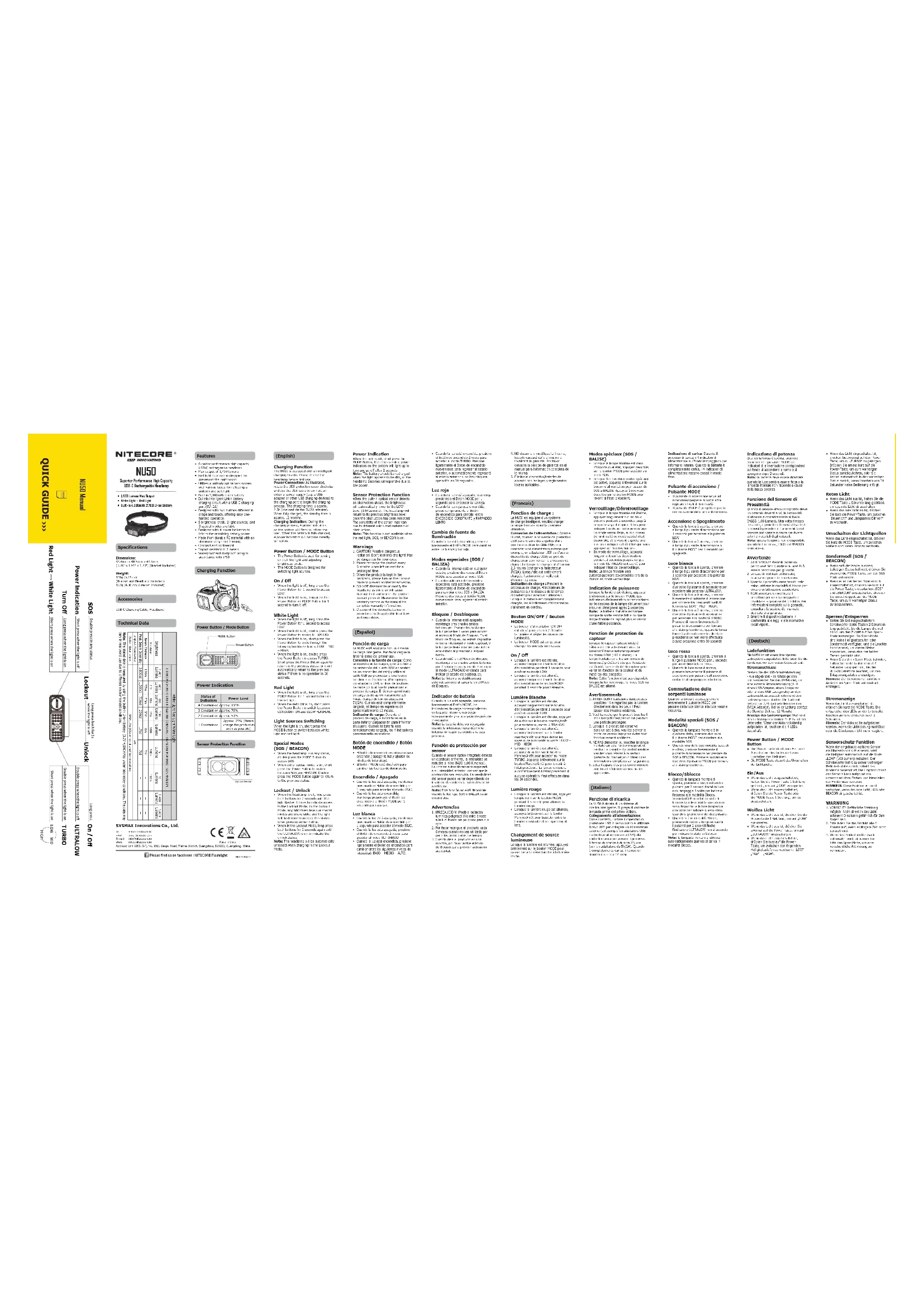 Lorsque la lampe frontale est éteinte, appuyez longuement sur les deux boutons pendant 2 secondes jusqu'à ce que le voyant clignote 3 fois pour indiquer l'accès au mode verrouillage. En mode verrouillage, aucun niveau de luminosité ou mode spécial n’est disponible, et le voyant clignote une fois pour indiquer cet état lorsque vous appuyez sur l'un des boutons. En mode de verrouillage, appuyez longuement sur les deux boutons pendant 2 secondes jusqu’à ce que le mode ULTRALOW soit activé pour indiquer l’état de déverrouillage.Note: La lampe frontale sera automatiquement déverrouillée lors de la charge en mode verrouillage. Indication de puissance Lorsque la lumière est éteinte, appuyez brièvement sur le bouton MODE. Les indicateurs d'alimentation correspondants sur le dessous de la lampe s'allument tour à tour et s'éteignent après 2 secondes.Note: La batterie doit être rechargée lorsque la sortie semble faible ou que la lampe frontale ne répond plus en raison d’une faible puissance. Fonction de protection du capteur Lorsque le capteur optique intégré détecte un obstacle devant vous, la luminosité baisse automatiquement au niveau LOW (100 Lumens). La lampe frontale revient à son niveau de luminosité précédent dès que l'obstacle est écarté. La sensibilité du capteur peut varier en fonction de la couleur et du matériau des obstacles.Note: Cette fonction n'est pas disponible lorsque la lumière rouge, le mode SOS ou BALISE est allumé. Avertissements 1. ATTENTION ! Radiations dangereuses possibles ! Ne regardez pas la lumière directement dans les yeux ! Peut causer des troubles oculaires.2. Veuillez recharger le produit tous les 6 mois lorsqu’il n’est pas utilisé pendant une période prolongée.3. Lorsque le produit est conservé dans un sac à dos, veuillez activer le mode de verrouillage pour éviter tout fonctionnement accidentel. 4. NE PAS démonter ou modier la lampe frontale car cela l’endommagerait et rendrait la garantie du produit invalide. Veuillez vous référer à la section garantie du manuel pour obtenir des informations complètes sur la garantie.5. Jetez l’appareil/les piles conformément aux lois et réglementations locales applicables. (Italiano) Funzione di ricarica La NU50 è dotata di un sistema di ricarica intelligente. Si prega di caricare la lampada prima del primo utilizzo.Collegamento all'alimentazione: Come illustrato, ruotare il coperchio di protezione USB in senso orario e utilizzare il cavo USB per collegare un alimentatore esterno (ad esempio un adattatore USB o altri dispositivi di ricarica USB) alla porta di ricarica per avviare il processo. Il tempo di ricarica è di circa 2,5 ore (con un adattatore da 5V/2A). Quando è completamente carica, il tempo di standby è di circa 12 mesi.Indicazione di carica: Durante il processo di carica, i 4 indicatori di alimentazione sul fondo lampeggiano per informare l'utente. Quando la batteria è completamente carica, i 4 indicatori di alimentazione restano accesi in modo sso. Pulsante di accensione / Pulsante MODE