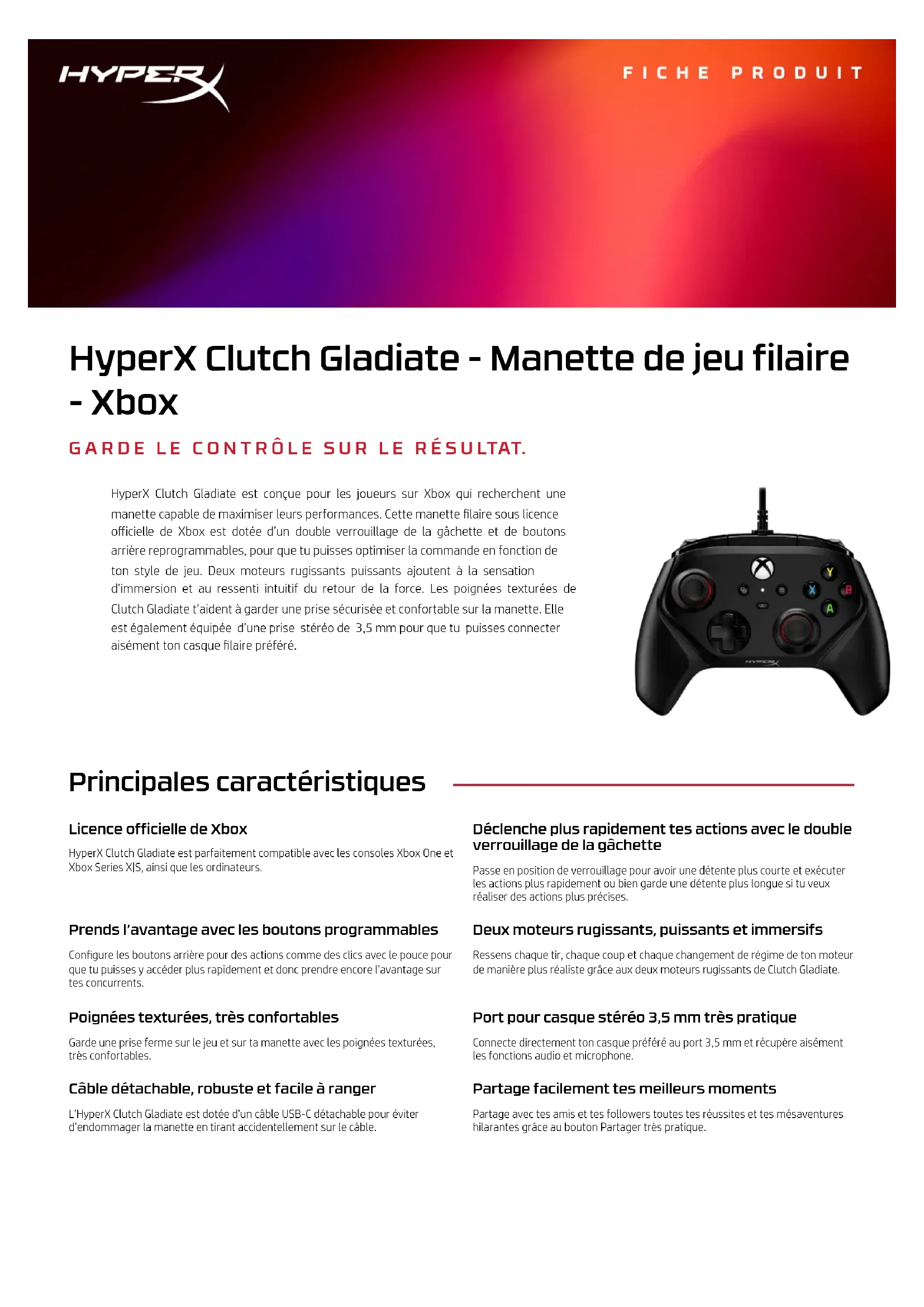 F I C H E P R O D U I T HyperX Clutch Gladiate - Manette de jeu filaire - Xbox G A R D E L E C O N T R Ô L E S U R L E R É S U LTAT. HyperX Clutch Gladiate est conçue pour les joueurs sur Xbox qui recherchent une manette capable de maximiser leurs performances. Cette manette laire sous licence officielle de Xbox est dotée d’un double verrouillage de la gâchette et de boutons arrière reprogrammables, pour que tu puisses optimiser la commande en fonction deton style de jeu. Deux moteurs rugissants puissants ajoutent à la sensationd’immersion et au ressenti intuitif du retour de la force. Les poignées texturées deClutch Gladiate t’aident à garder une prise sécurisée et confortable sur la manette. Elleest également équipée d’une prise stéréo de 3,5 mm pour que tu puisses connecteraisément ton casque laire préféré. Principales caractéristiques Licence officielle de Xbox HyperX Clutch Gladiate est parfaitement compatible avec les consoles Xbox One etXbox Series X|S, ainsi que les ordinateurs. Déclenche plus rapidement tes actions avec le double verrouillage de la gâchette Passe en position de verrouillage pour avoir une détente plus courte et exécuterles actions plus rapidement ou bien garde une détente plus longue si tu veuxréaliser des actions plus précises. Prends l’avantage avec les boutons programmables Congure les boutons arrière pour des actions comme des clics avec le pouce pourque tu puisses y accéder plus rapidement et donc prendre encore l’avantage surtes concurrents. Deux moteurs rugissants, puissants et immersifs Ressens chaque tir, chaque coup et chaque changement de régime de ton moteurde manière plus réaliste grâce aux deux moteurs rugissants de Clutch Gladiate. Poignées texturées, très confortables Garde une prise ferme sur le jeu et sur ta manette avec les poignées texturées,très confortables. Port pour casque stéréo 3,5 mm très pratique Connecte directement ton casque préféré au port 3,5 mm et récupère aisémentles fonctions audio et microphone. Câble détachable, robuste et facile à ranger L’HyperX Clutch Gladiate est dotée d’un câble USB-C détachable pour éviterd’endommager la manette en tirant accidentellement sur le câble. Partage facilement tes meilleurs moments Partage avec tes amis et tes followers toutes tes réussites et tes mésaventureshilarantes grâce au bouton Partager très pratique.Nom des produits Nom du produit: HyperX Clutch Gladiate - Manette de jeu laire - Xbox Références des produits Référence du produit: 6L366AA Garantie Garantie fabricant: 2 ans Apparence Couleur principale du produit: Noir Contenu de l'emballage Contenu de l’emballage: HyperX Clutch Gladiate, câble USB-C vers USB-A Compatibilité Déclaration de compatibilité: Xbox Series X|S, Xbox One, PC Dimensions Hauteur (mesure métrique): 64,68 mm Largeur (mesure métrique): 110,56 mm Longueur (mesure métrique): 155 mm Périphériques d'entrée et multimédia Longueur des câbles (mesure métrique): 2,95 m Type de connexion: Filaire Type de câble: Câble USB-C vers USB-A amovible Grammages Notice de poids (métrique): 280 gNOTES SUR LA DESCRIPTION MARKETING © Copyright 2023 HP Development Company, L.P. Les informations contenues dans le présent document peuvent être modiées à tout moment et sans préavis. Les seules garanties relatives aux produits et services HP sont énoncées dans les déclarations de garantie expresse fournies avec ces produits et services. Aucune information du présent document ne saurait être considérée comme constituant une garantie complémentaire. HP décline toute responsabilité quant aux éventuelles erreurs ou omissions techniques ou rédactionnelles qui pourraient être constatées dans le présent document.