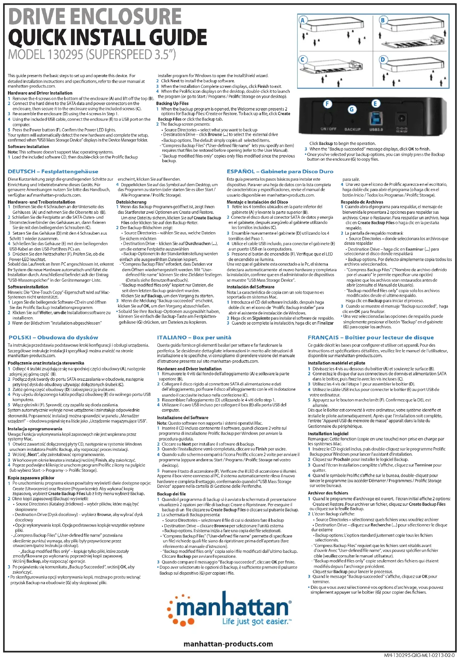 MODEL 130295 SUPERSPEED 3.5” FRANÇAIS – Boîtier pour lecteur de disque Ce guide décrit les bases pour configurer et utiliser cet appareil. Pour des instructions et spécifications détaillées, veuillez lire le manuel de l’utilisateur, disponible sur manhattan-products.com.Installation matériel et pilote 1 Dévissez les 4 vis au dessous du boîtier (A) et soulevez le surface (B). 2 Connectez le disque dur aux connecteurs de donnés et alimentation SATA dans le boîtier, puis fixez le avec les vis incluses (C). 3 Utilisez les 4 vis de l’étape 1 pour assembler le boîtier (D). 4 Utilisez le câble USB inclus pour connecter le boîtier (E) au port USB de votre ordinateur. 5 Appuyez sur le bouton marche/arrêt (F). Confirmez que la DEL est allumée.Dès que le Boîtier est connecté à votre ordinateur, votre système identifie et installe le pilote automatiquement. Après que l’installation soit complète, l’entrée “Appareil USB de mémoire de masse” apparaît dans la liste du Gestionnaire du périphérique.Installation logicielRemarque: Cette fonction (copie en une touche) non prise en charge par les systèmes Mac. 1 Insérez le CD logiciel inclus, puis double-cliquez sur le programme Prolific Backup pour Windows pour lancer l’assistant d’installation. 2 Cliquez sur Prochain pour installer le logiciel Backup. 3 Quand l’écran Installation complète s’affiche, cliquez sur Terminer pour quitter. 4 Quand le symbole Prolific s’affiche sur le bureau, double-cliquez pour lancer le programme (ou accéder Démarrer / Programmes / Prolific Storage sur votre bureau).Archiver des fichiers 1 Quand le programme d’archivage est ouvert, l’écran initial affiche 2 options: Create et Restore. Pour archiver un fichier, cliquez sur Create Backup Files ou cliquez sur la feuille Backup.2 L’écran Backup s’affiche: •SourceDirectories–sélectionnezquelschiersvousvoudriezarchiver