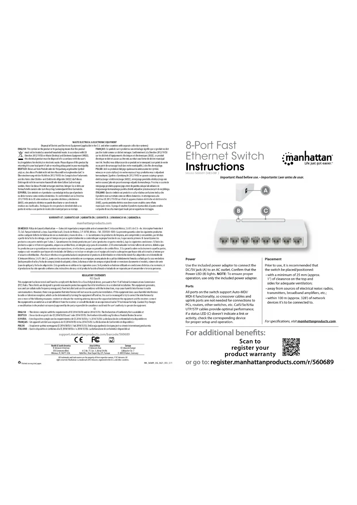 - dentro de 100 m de los dispositivos de red que estan conectados. Para mas especificaciones, visita manhattanproducts.com. Registre el producto en register.manhattanproducts.com/r/560689 o escanee el código QR en la cubierta. FRANÇAIS Alimentation Utilisez l’adaptateur secteur inclus pour connecter le jack Vcc/5V (A) à une prise électrique. Assurez-vous que que le voyant “PWR” (B) est allumé. REMARQUE: Afin d’assurer le propre fonctionnement, n’utilisez que l’adaptateur secteur fourni avec ce produit. Connexions Tous les ports de ce commutateur prennent en charge la fonctionnalité Auto-MDI/ MDI-X, donc des câbles croisés et des liaisons montantes ne sont pas nécessaires pour des connections aux PC, routeurs, etc. Des câbles Cat5/5e/6/6a UTP/STP garantissent des performances optimales; si un DEL (C) n’indique pas une connexion (allumé) ou d’activité (clignotant), vérifiez l’appareil correspondant. Placement Avant d’utiliser le commutateur, il est recommandé de le placer: