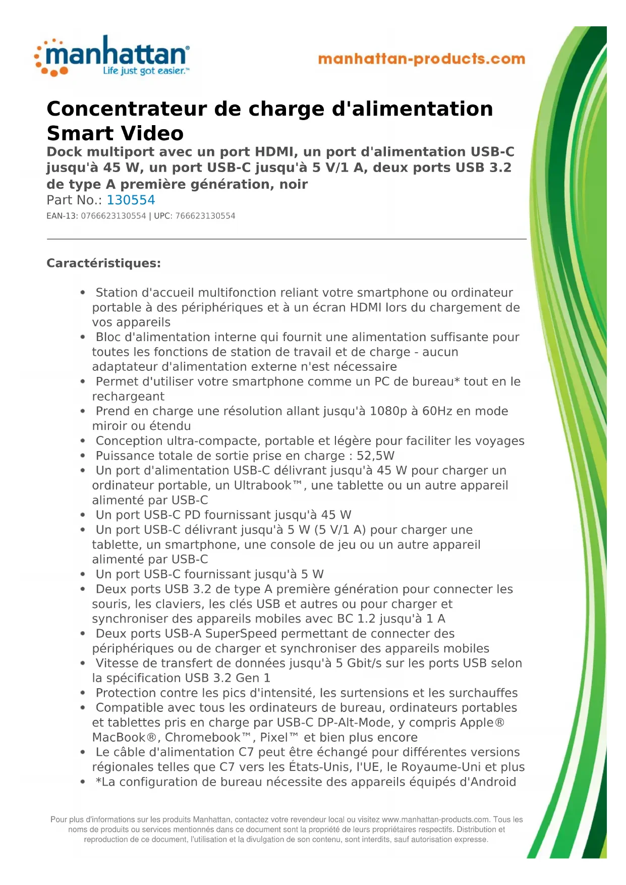 Concentrateur de charge d'alimentation Smart Video Dock multiport avec un port HDMI, un port d'alimentation USB-C jusqu'à 45 W, un port USB-C jusqu'à 5 V/1 A, deux ports USB 3.2 de type A première génération, noir Part No.: 130554 EAN-13: 0766623130554 | UPC: 766623130554 Caractéristiques: Station d'accueil multifonction reliant votre smartphone ou ordinateur portable à des périphériques et à un écran HDMI lors du chargement de vos appareils Bloc d'alimentation interne qui fournit une alimentation suffisante pour toutes les fonctions de station de travail et de charge - aucun adaptateur d'alimentation externe n'est nécessaire Permet d'utiliser votre smartphone comme un PC de bureau* tout en le rechargeant Prend en charge une résolution allant jusqu'à 1080p à 60Hz en mode miroir ou étendu Conception ultra-compacte, portable et légère pour faciliter les voyages Puissance totale de sortie prise en charge : 52,5W Un port d'alimentation USB-C délivrant jusqu'à 45 W pour charger un ordinateur portable, un Ultrabook™, une tablette ou un autre appareil alimenté par USB-C Un port USB-C PD fournissant jusqu'à 45 W Un port USB-C délivrant jusqu'à 5 W (5 V/1 A) pour charger une tablette, un smartphone, une console de jeu ou un autre appareil alimenté par USB-C Un port USB-C fournissant jusqu'à 5 W Deux ports USB 3.2 de type A première génération pour connecter les souris, les claviers, les clés USB et autres ou pour charger et synchroniser des appareils mobiles avec BC 1.2 jusqu'à 1 A Deux ports USB-A SuperSpeed permettant de connecter des périphériques ou de charger et synchroniser des appareils mobiles Vitesse de transfert de données jusqu'à 5 Gbit/s sur les ports USB selon la spécification USB 3.2 Gen 1 Protection contre les pics d'intensité, les surtensions et les surchauffes Compatible avec tous les ordinateurs de bureau, ordinateurs portables et tablettes pris en charge par USB-C DP-Alt-Mode, y compris Apple® MacBook®, Chromebook™, Pixel™ et bien plus encore Le câble d'alimentation C7 peut être échangé pour différentes versions régionales telles que C7 vers les États-Unis, l'UE, le Royaume-Uni et plus *La configuration de bureau nécessite des appareils équipés d'Android Pour plus d'informations sur les produits Manhattan, contactez votre revendeur local ou visitez www.manhattan-products.com. Tous les noms de produits ou services mentionnés dans ce document sont la propriété de leurs propriétaires respectifs. Distribution et reproduction de ce document, l'utilisation et la divulgation de son contenu, sont interdits, sauf autorisation expresse.9 et versions ultérieures qui possèdent une sortie vidéo sur USB-C Garantie de trois ans Spécifications: Normes et certifications
