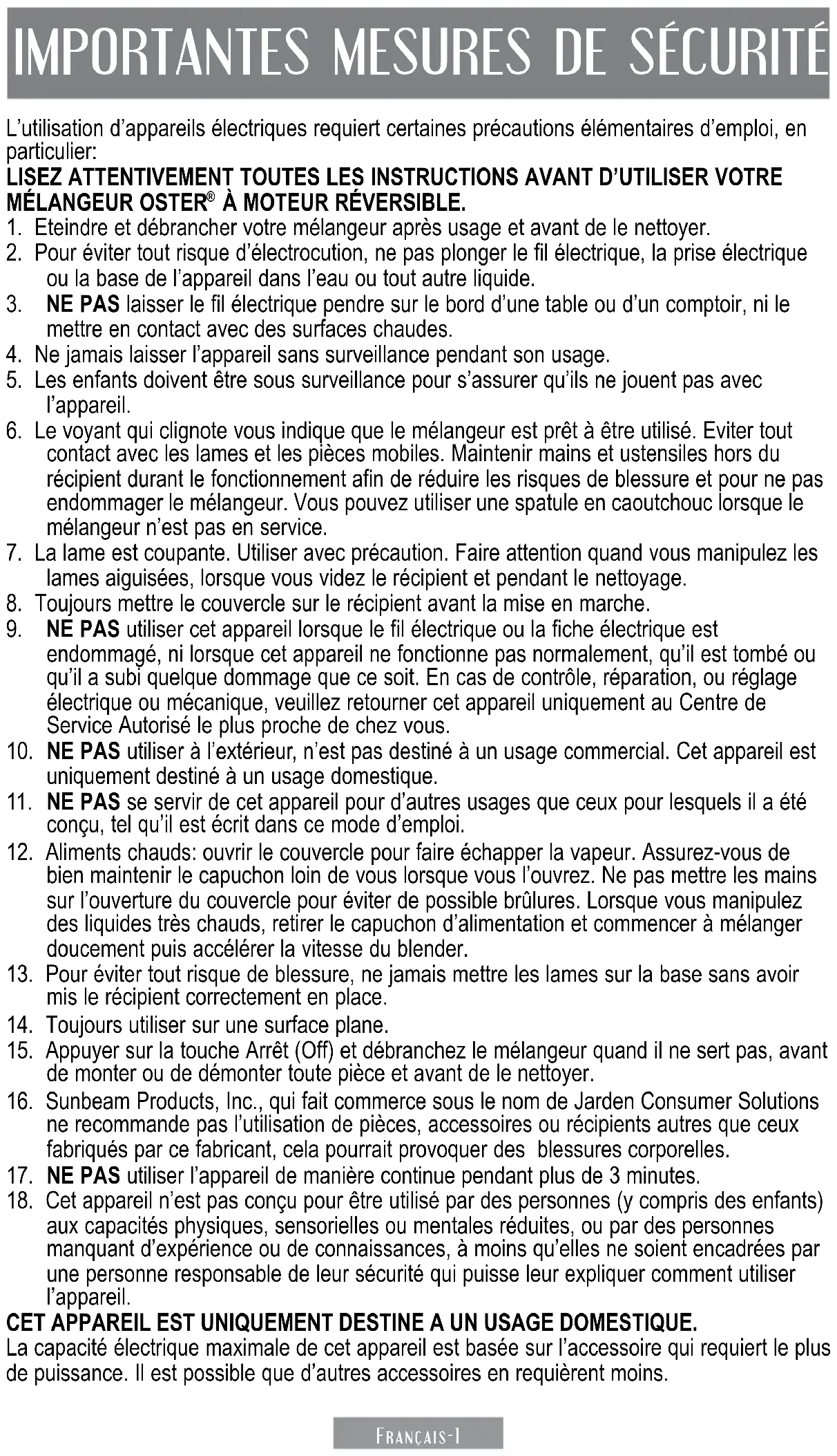 Holmes Products (Europe) Limited 1 Francis Grove London SW19 4DT UKFrançais-1 L’utilisation d’appareils électriques requiert certaines précautions élémentaires d’emploi, en particulier: LISEZ ATTENTIVEMENT TOUTES LES INSTRUCTIONS AVANT D’UTILISER VOTRE MéLANGEUR OSTER
