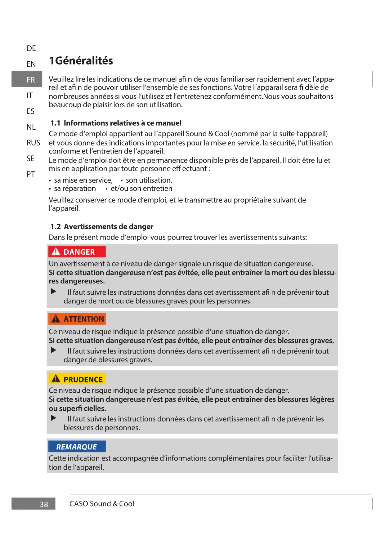 Dans le présent mode d‘emploi vous pourrez trouver les avertissements suivants: Un avertissement à ce niveau de danger signale un risque de situation dangereuse. Si cette situation dangereuse n‘est pas évitée, elle peut entraîner la mort ou des blessu- res dangereuses. Il faut suivre les instructions données dans cet avertissement a n de prévenir tout danger de mort ou de blessures graves pour les personnes. Ce niveau de risque indique la présence possible d‘une situation de danger. Si cette situation dangereuse n‘est pas évitée, elle peut entraîner des blessures graves. Il faut suivre les instructions données dans cet avertissement a n de prévenir tout danger de blessures graves. Ce niveau de risque indique la présence possible d‘une situation de danger. Si cette situation dangereuse n‘est pas évitée, elle peut entraîner des blessures légères ou super cielles. Il faut suivre les instructions données dans cet avertissement a n de prévenir les blessures de personnes. Cette indication est accompagnée d‘informations complémentaires pour faciliter l‘utilisa- tion de l‘appareil. DANGER ATTENTION PRUDENCE REMARQUECASO Sound & Cool