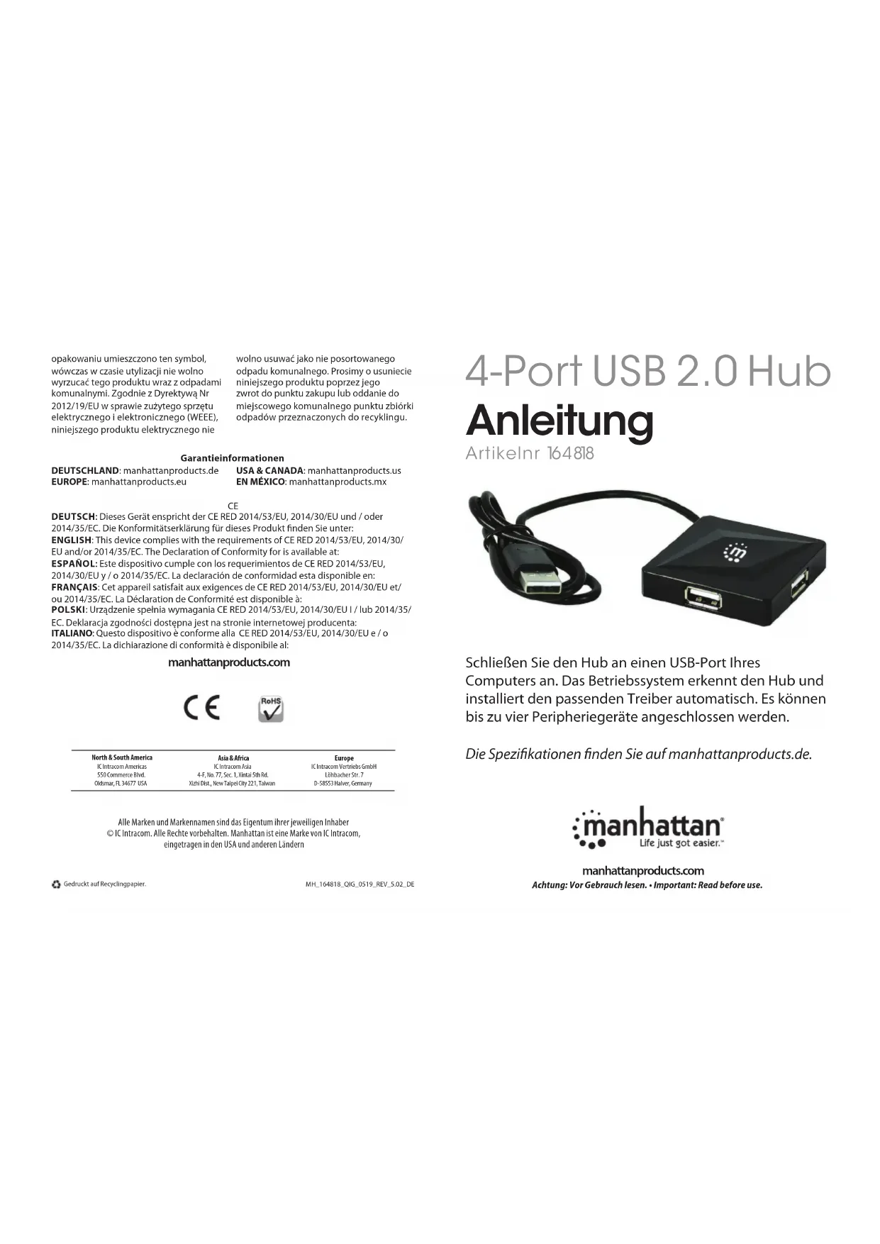 164818 - USB hub MANHATTAN - Notice d'utilisation et mode d'emploi gratuit