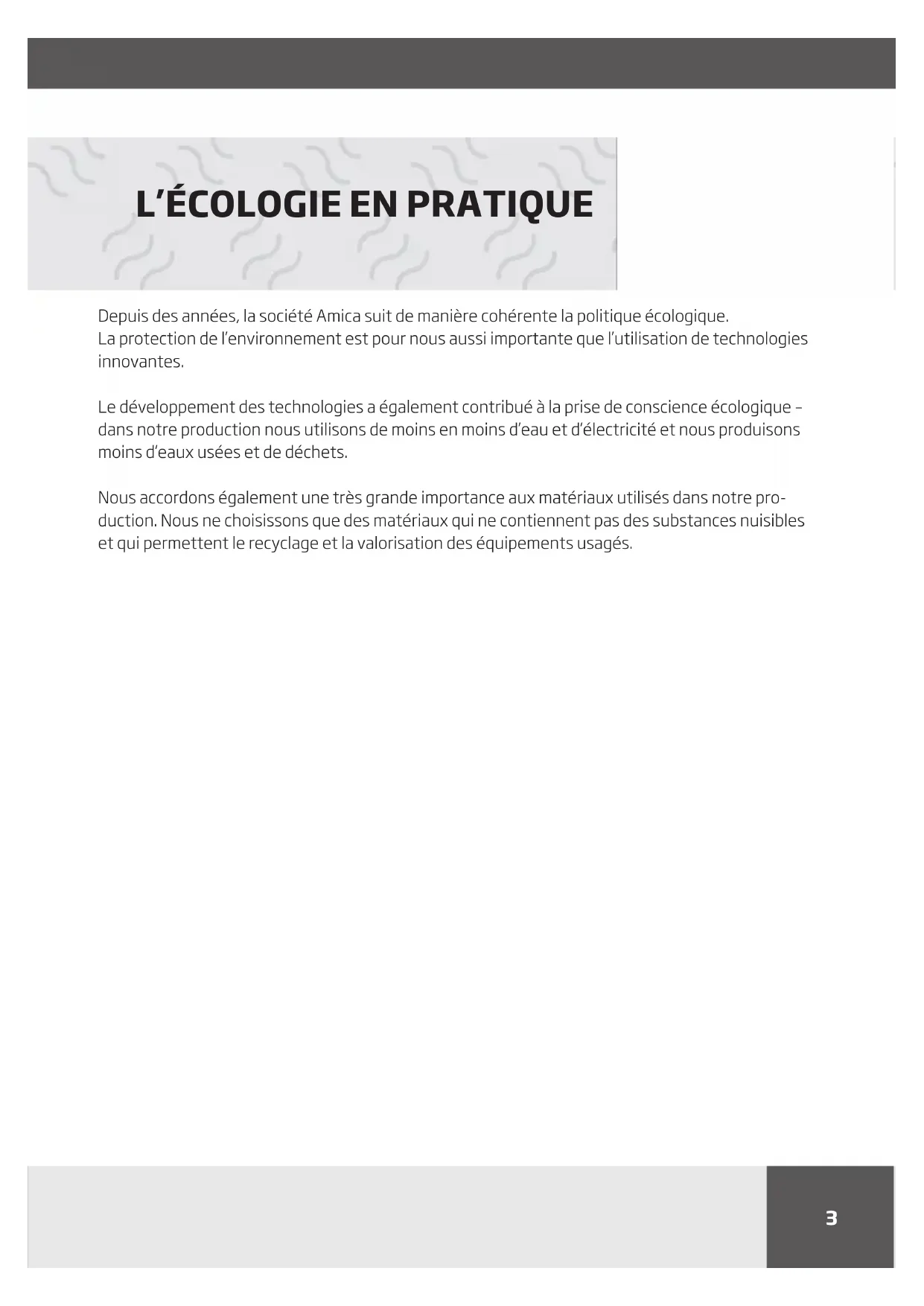 SOMMAIRE3 Depuis des années, la société Amica suit de manière cohérente la politique écologique. La protection de l’environnement est pour nous aussi importante que l’utilisation de technologies innovantes. Le développement des technologies a également contribué à la prise de conscience écologique – dans notre production nous utilisons de moins en moins d’eau et d’électricité et nous produisons moins d’eaux usées et de déchets. Nous accordons également une très grande importance aux matériaux utilisés dans notre pro- duction. Nous ne choisissons que des matériaux qui ne contiennent pas des substances nuisibles et qui permettent le recyclage et la valorisation des équipements usagés.