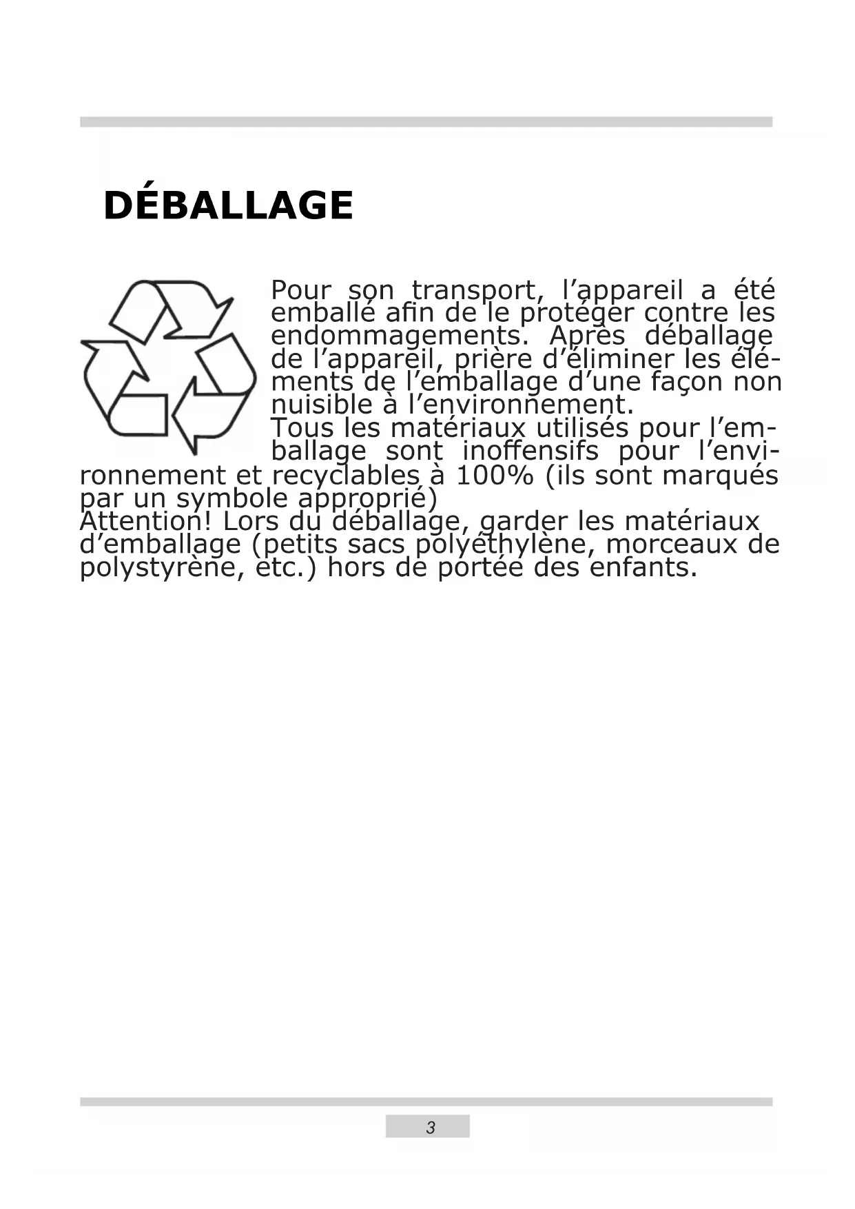 - Nettoyage et entretien DÉBALLAGE Pour son transport, l’appareil a été emballé an de le protéger contre les endommagements. Après déballage de l’appareil, prière d’éliminer les élé- ments de l’emballage d’une façon non nuisible à l’environnement. Tous les matériaux utilisés pour l’em- ballage sont inoensifs pour l’envi- ronnement et recyclables à 100% (ils sont marqués par un symbole approprié) Attention! Lors du déballage, garder les matériaux d’emballage (petits sacs polyéthylène, morceaux de polystyrène, etc.) hors de portée des enfants.4 ÉLIMINATION DES p. 243