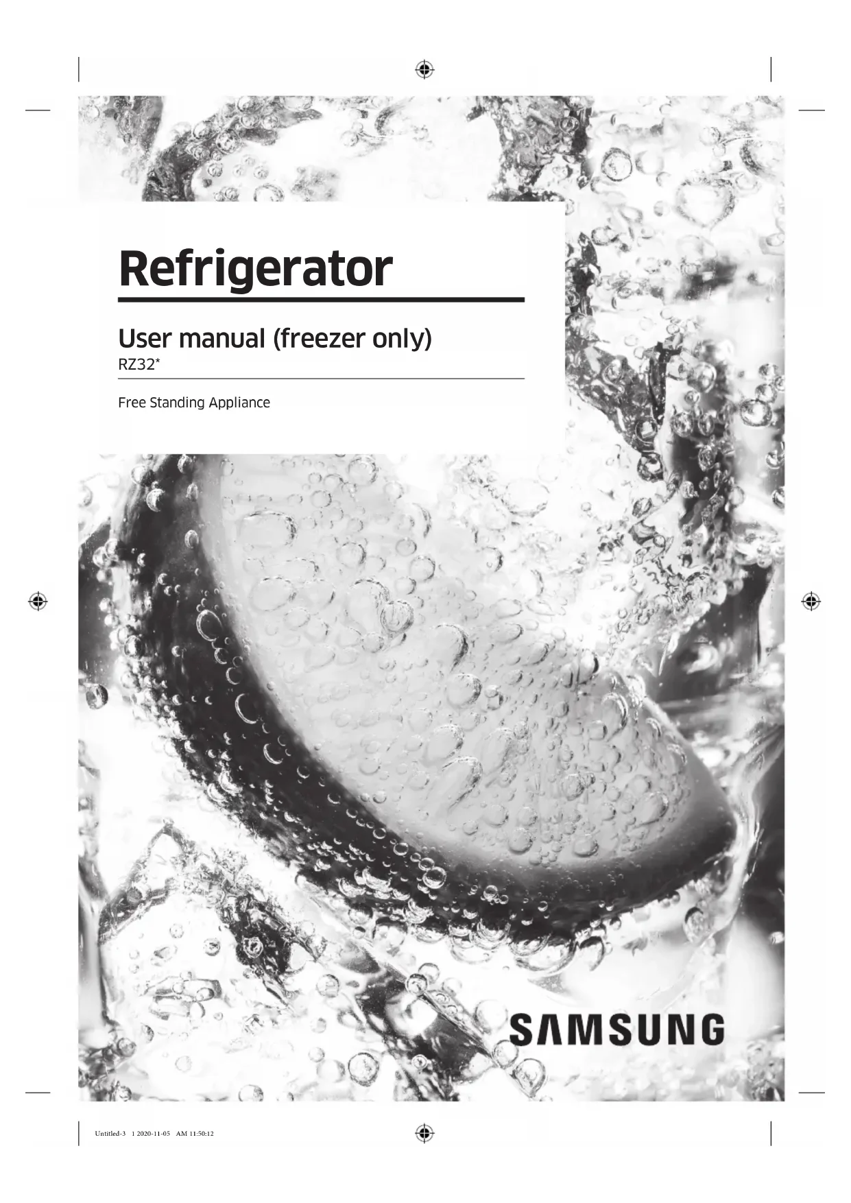 - Due to pressure equalizing when opening and closing the refrigerator door, whooshing sounds may occur. Untitled-3 61 2020-11-05 AM 11:50:27Memo Untitled-3 62 2020-11-05 AM 11:50:27Memo Untitled-3 63 2020-11-05 AM 11:50:27Contact SAMSUNG WORLD WIDE If you have any questions or comments relating to Samsung products, please contact the SAMSUNG customer care center. Country Contact Center Web Site SOUTH AFRICA 0860 SAMSUNG (726 7864) www.samsung.com/support NAMIBIA 08 197 267 864 ZAMBIA 3434 MAURITIUS 800 5050 REUNION 0262 50 88 80 MOZAMBIQUE 84 726 7864 NIGERIA 0800 726 7864 www.samsung.com/africa_en/support Ghana 0800 100 077 Cote D’Ivoire 8000 0077 www.samsung.com/africa_fr/supportSENEGAL 800 00 0077 CAMEROON 67095 0077 KENYA 0800 545 545 www.samsung.com/support UGANDA 0800 300 300 TANZANIA 0800 780 089 RWANDA 9999 DRC 499 999 SUDAN 1969 DA68-04131C-00 Untitled-3 64 2020-11-05 AM 11:50:27Réfrigérateur Manuel d'utilisation (congélateur uniquement) RZ32* Appareil non encastrable Untitled-8 1 11/10/2020 7:00:02 PMFrançais2 Sommaire Sommaire Consignes de sécurité 3 Consignes et symboles de sécurité importants : 6 Symboles d'avertissement importants concernant le transport et le lieu d'installation de l'appareil 7 Avertissements importants concernant l'installation 7 Consignes d'installation 12 Avertissements importants concernant l'utilisation 13 Avertissement relatif à l'utilisation 18 Consignes d'utilisation 19 Consignes de nettoyage 21 Avertissements importants concernant la mise au rebut 22 Conseils complémentaires pour une utilisation appropriée 24 Conseils en matière d'économie d'énergie 25 Cet appareil est destiné à être utilisé dans les applications domestiques et similaires telles que : 26 Instructions concernant la règlementation DEEE 27 Installation 28 Présentation rapide du réfrigérateur 28 Installation étape par étape 29 Opérations 35 Panneau de commande 35 Fonctions spéciales 37 Maintenance 41 Inversion des portes 41 Utilisation et entretien 50 Nettoyage 53 Remplacement 53 Installation en duo 54 Dépannage 61 Généralités 61 Entendez-vous des sons anormaux provenant du réfrigérateur ? 64 Untitled-8 2 11/10/2020 7:00:02 PMFrançais 3 Consignes de sécurité