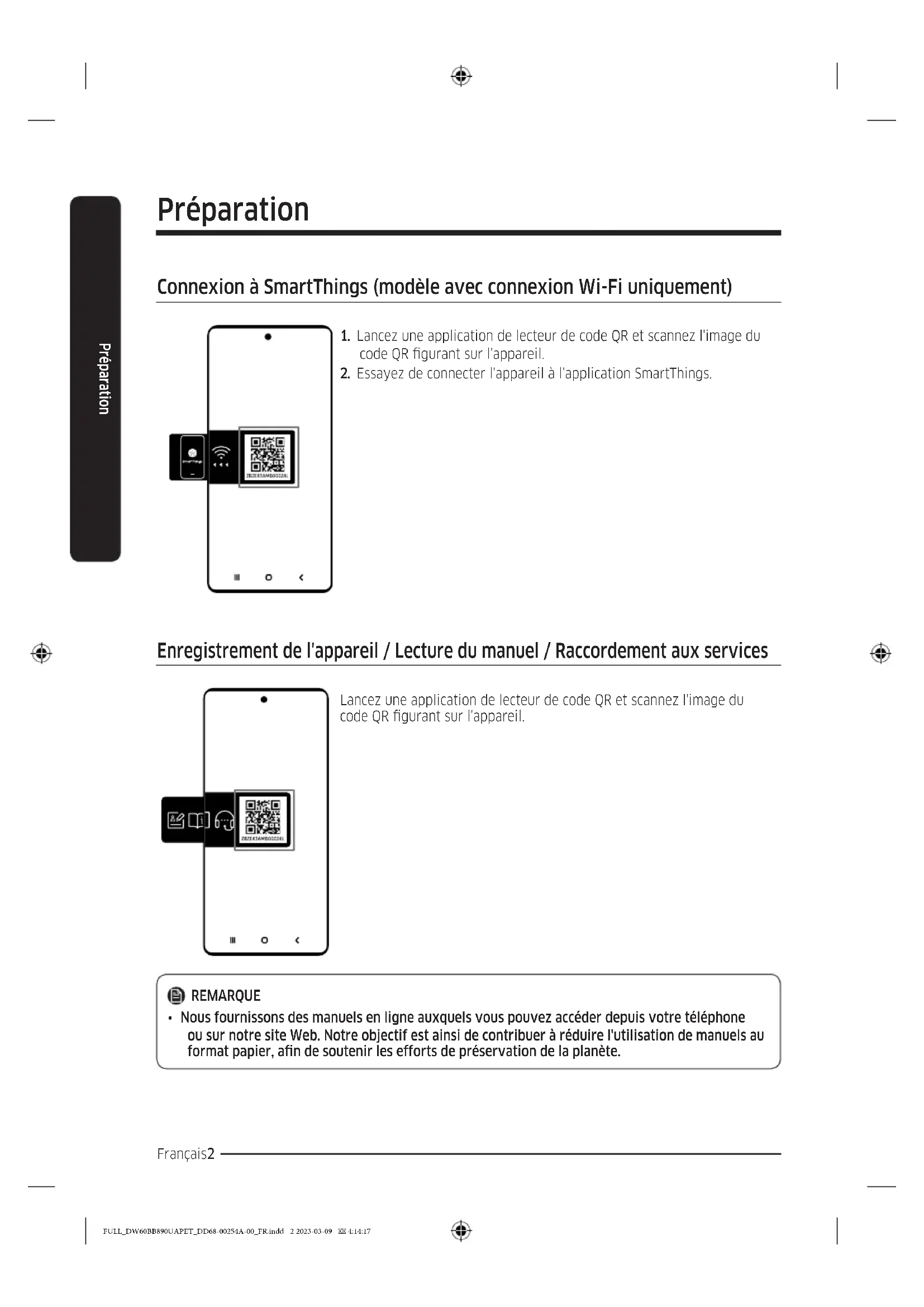 Lave-vaisselle Manuel d'utilisation Séries DW60B*8***** / DW60B*7***** FULL_DW60BB890UAPET_DD68-00254A-00_FR.indd 1 2023-03-09 4:14:17Français2 Préparation Préparation Connexion à SmartThings (modèle avec connexion Wi-Fi uniquement)