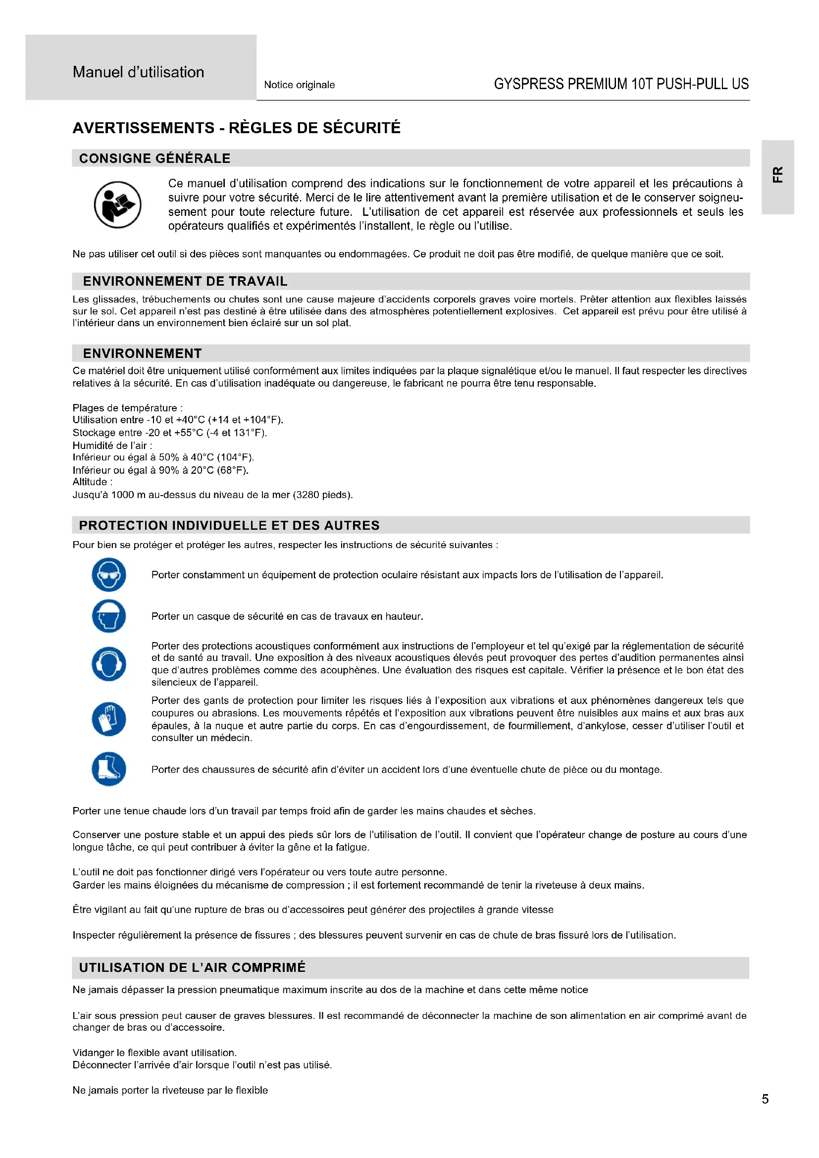 Pour bien se protéger et protéger les autres, respecter les instructions de sécurité suivantes : Porter constamment un équipement de protection oculaire résistant aux impacts lors de l’utilisation de l’appareil. Porter un casque de sécurité en cas de travaux en hauteur. Porter des protections acoustiques conformément aux instructions de l’employeur et tel qu’exigé par la réglementation de sécurité et de santé au travail. Une exposition à des niveaux acoustiques élevés peut provoquer des pertes d’audition permanentes ainsi que d’autres problèmes comme des acouphènes. Une évaluation des risques est capitale. Vérier la présence et le bon état des silencieux de l’appareil. Porter des gants de protection pour limiter les risques liés à l’exposition aux vibrations et aux phénomènes dangereux tels que coupures ou abrasions. Les mouvements répétés et l’exposition aux vibrations peuvent être nuisibles aux mains et aux bras aux épaules, à la nuque et autre partie du corps. En cas d’engourdissement, de fourmillement, d’ankylose, cesser d’utiliser l’outil et consulter un médecin. Porter des chaussures de sécurité an d’éviter un accident lors d’une éventuelle chute de pièce ou du montage. Porter une tenue chaude lors d’un travail par temps froid an de garder les mains chaudes et sèches. Conserver une posture stable et un appui des pieds sûr lors de l’utilisation de l’outil. Il convient que l’opérateur change de posture au cours d’une longue tâche, ce qui peut contribuer à éviter la gêne et la fatigue. L’outil ne doit pas fonctionner dirigé vers l’opérateur ou vers toute autre personne. Garder les mains éloignées du mécanisme de compression ; il est fortement recommandé de tenir la riveteuse à deux mains. Être vigilant au fait qu’une rupture de bras ou d’accessoires peut générer des projectiles à grande vitesse Inspecter régulièrement la présence de ssures ; des blessures peuvent survenir en cas de chute de bras ssuré lors de l’utilisation.
