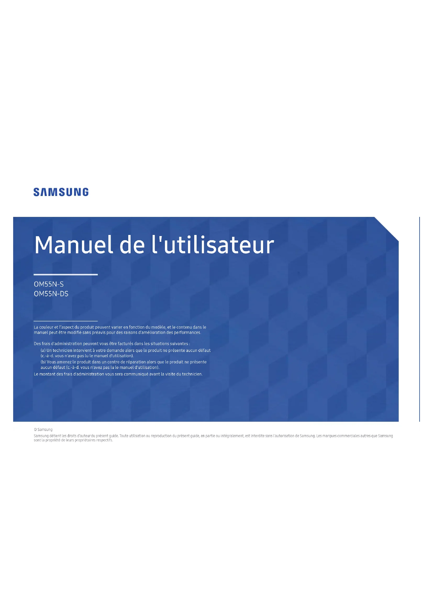 © Samsung Samsung détient les droits d'auteur du présent guide. Toute utilisation ou reproduction du présent guide, en partie ou intégralement, est interdite sans l'autorisation de Samsung. Les marques commerciales autres que Samsung sont la propriété de leurs propriétaires respectifs. Manuel de l'utilisateur OM55N-S OM55N-DS La couleur et l’aspect du produit peuvent varier en fonction du modèle, et le contenu dans le manuel peut être modié sans préavis pour des raisons d’amélioration des performances. Des frais d'administration peuvent vous être facturés dans les situations suivantes: (a) Un technicien intervient à votre demande alors que le produit ne présente aucun défaut (c.-à-d. vous n'avez pas lu le manuel d'utilisation). (b) Vous amenez le produit dans un centre de réparation alors que le produit ne présente aucun défaut (c.-à-d. vous n'avez pas lu le manuel d'utilisation). Le montant des frais d'administration vous sera communiqué avant la visite du technicien.Table des matières Avant utilisation du produit Consignes de sécurité 6 Symboles de sécurité 6 Électricité et sécurité 7 Installation 8 Fonctionnement 10 Nettoyage 12 Stockage et entretien 13 Préparatifs Vérification des composants 14 Ports 15 OM55N-S 15 OM55N-DS 16 Verrou antivol 17 Avant d'installer le produit (Guide d'installation) 18 OM55N-S 18 OM55N-DS 19 Installation du support mural 22 Installation du support mural 22 Spécifications du kit de montage mural (VESA) 22 Télécommande 23