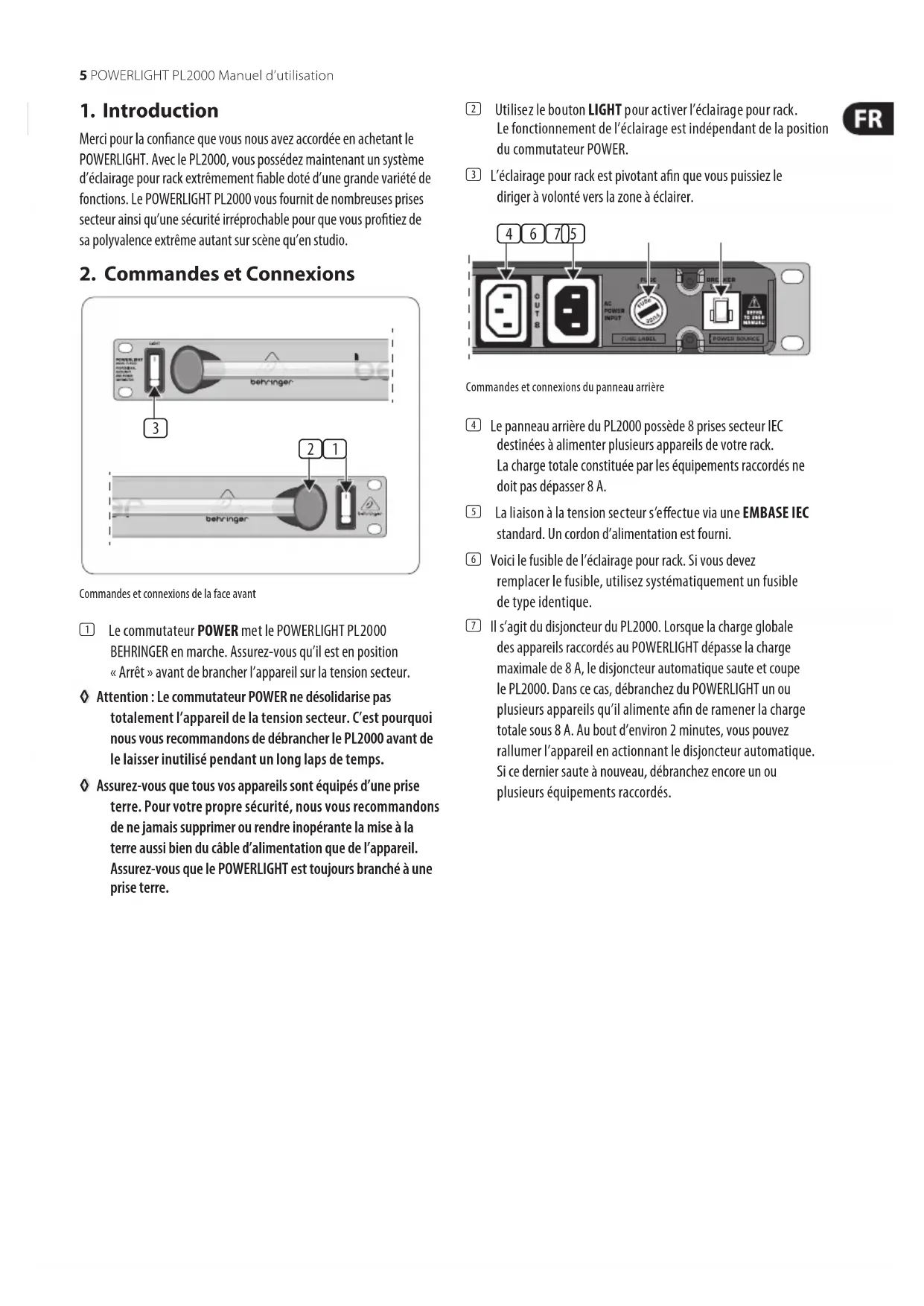 Merci pour la conance que vous nous avez accordée en achetant le POWERLIGHT. Avec le PL2000, vous possédez maintenant un système d’éclairage pour rack extrêmement able doté d’une grande variété de fonctions. Le POWERLIGHT PL2000 vous fournit de nombreuses prises secteur ainsi qu’une sécurité irréprochable pour que vous protiez de sa polyvalence extrême autant sur scène qu’en studio.