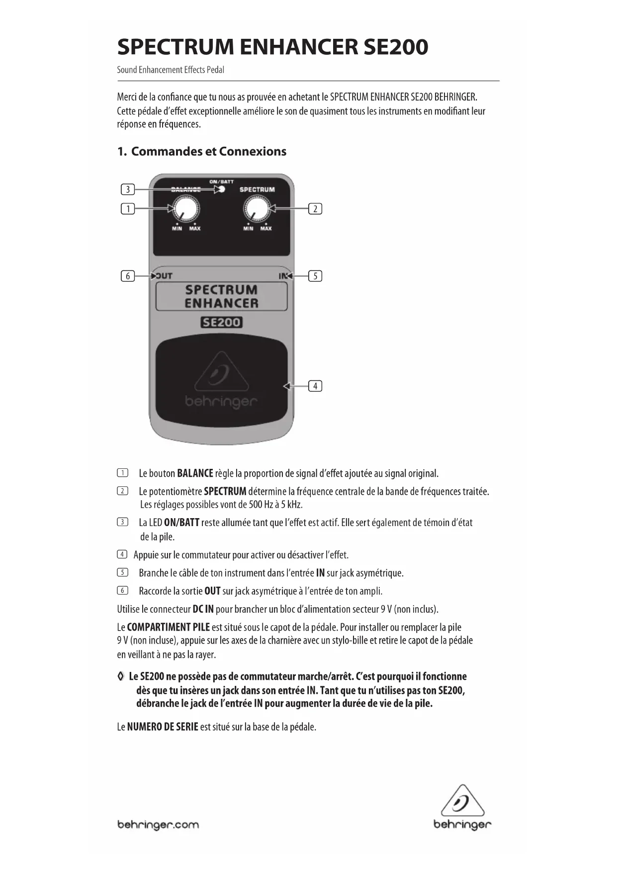 (1) Le bouton BALANCE règle la proportion de signal d’eet ajoutée au signal original. (2) Le potentiomètre SPECTRUM détermine la fréquence centrale de la bande de fréquences traitée. Les réglages possibles vont de 500 Hz à 5 kHz. (3) La LED ON/BATT reste allumée tant que l’eet est actif. Elle sert également de témoin d’état de la pile. (4) Appuie sur le commutateur pour activer ou désactiver l’eet. (5) Branche le câble de ton instrument dans l’entrée IN sur jack asymétrique. (6) Raccorde la sortie OUT sur jack asymétrique à l’entrée de ton ampli. Utilise le connecteur DC IN pour brancher un bloc d’alimentation secteur 9 V (non inclus). Le COMPARTIMENT PILE est situé sous le capot de la pédale. Pour installer ou remplacer la pile 9 V (non incluse), appuie sur les axes de la charnière avec un stylo-bille et retire le capot de la pédale en veillant à ne pas la rayer. ◊ Le SE200 ne possède pas de commutateur marche/arrêt. C’est pourquoi il fonctionne dès que tu insères un jack dans son entrée IN. Tant que tu n’utilises pas ton SE200, débranche le jack de l’entrée IN pour augmenter la durée de vie de la pile. Le NUMERO DE SERIE est situé sur la base de la pédale. (1) (6) (3) (2) (5)