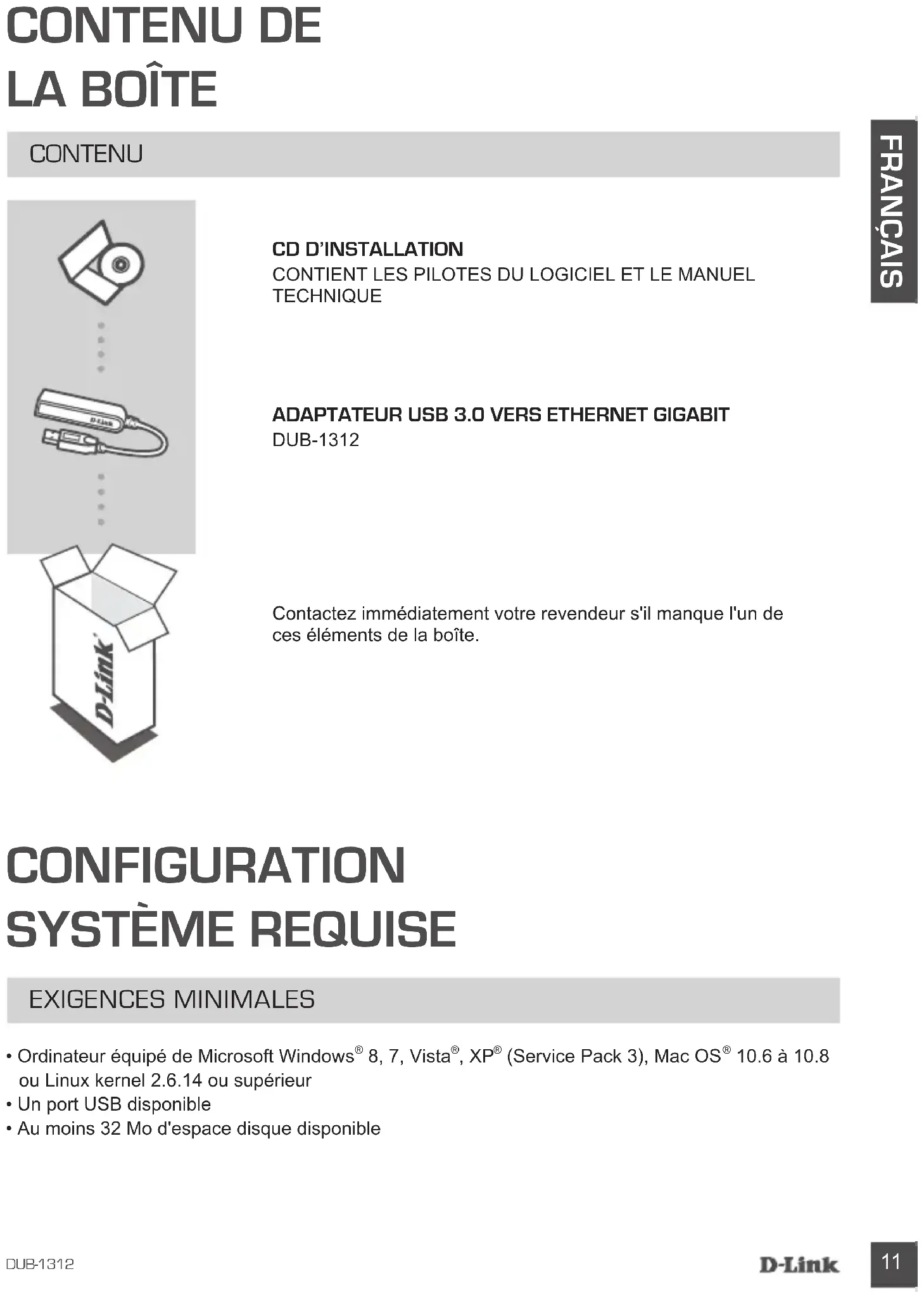 CONTIENT LES PILOTES DU LOGICIEL ET LE MANUEL TECHNIQUE ADAPTATEUr USB 3.0 VErS EThErNET GIGABIT DUB-1312 CONTENU Contactez immédiatement votre revendeur s'il manque l'un de ces éléments de la boîte. EXIGENCES MINIMALESDUB-1312