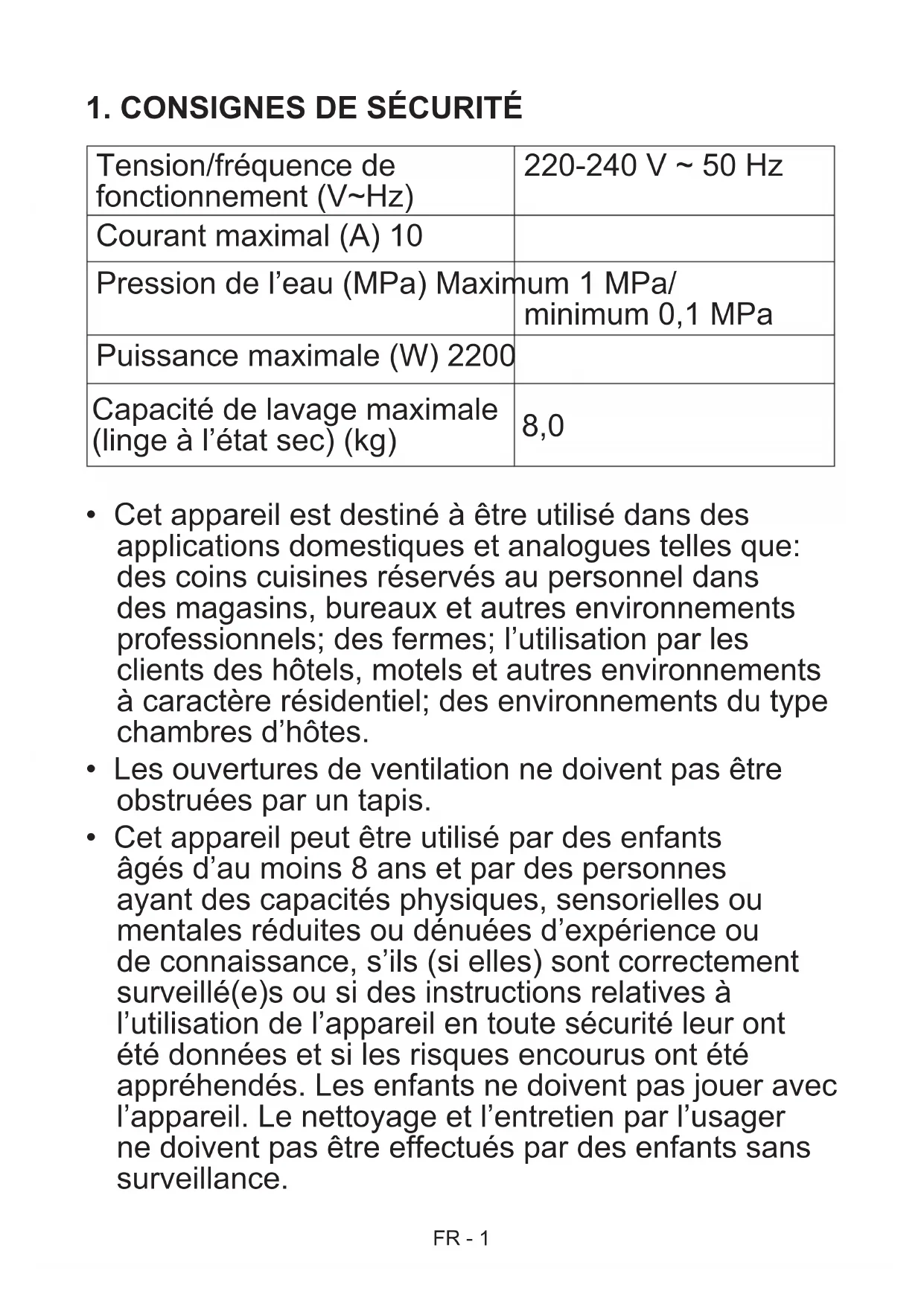 - Cet appareil peut être utilisé par des enfants âgés d’au moins 8 ans et par des personnes ayant des capacités physiques, sensorielles ou mentales réduites ou dénuées d’expérience ou de connaissance, s’ils (si elles) sont correctement surveillé(e)s ou si des instructions relatives à l’utilisation de l’appareil en toute sécurité leur ont été données et si les risques encourus ont été appréhendés. Les enfants ne doivent pas jouer avec l’appareil. Le nettoyage et l’entretien par l’usager ne doivent pas être effectués par des enfants sans surveillance.FR - 2