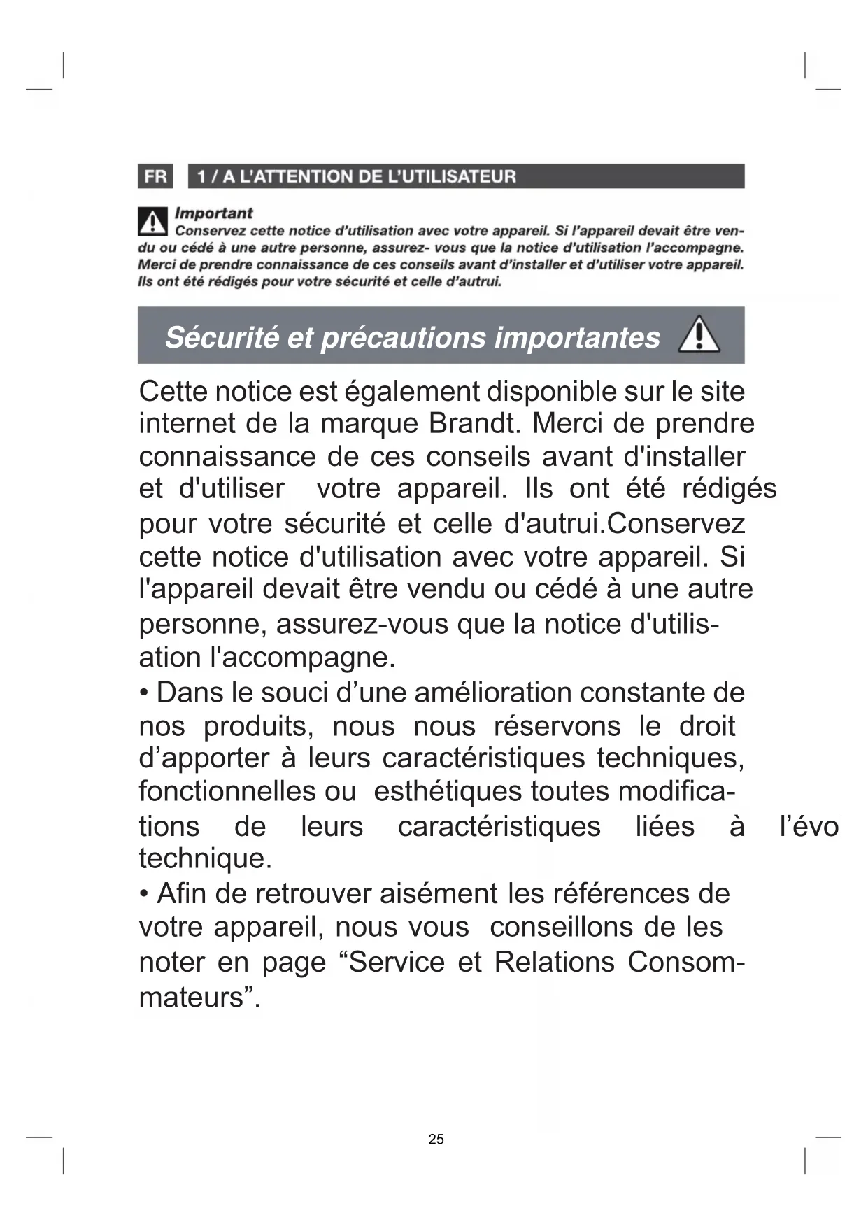 - Afin de retrouver aisément les références de votre appareil, nous vous conseillons de les noter en page “Service et Relations Consom- mateurs”. 25Précautions importantes 1 / A L’ATTENTION DE L’UTILISATEUR FR