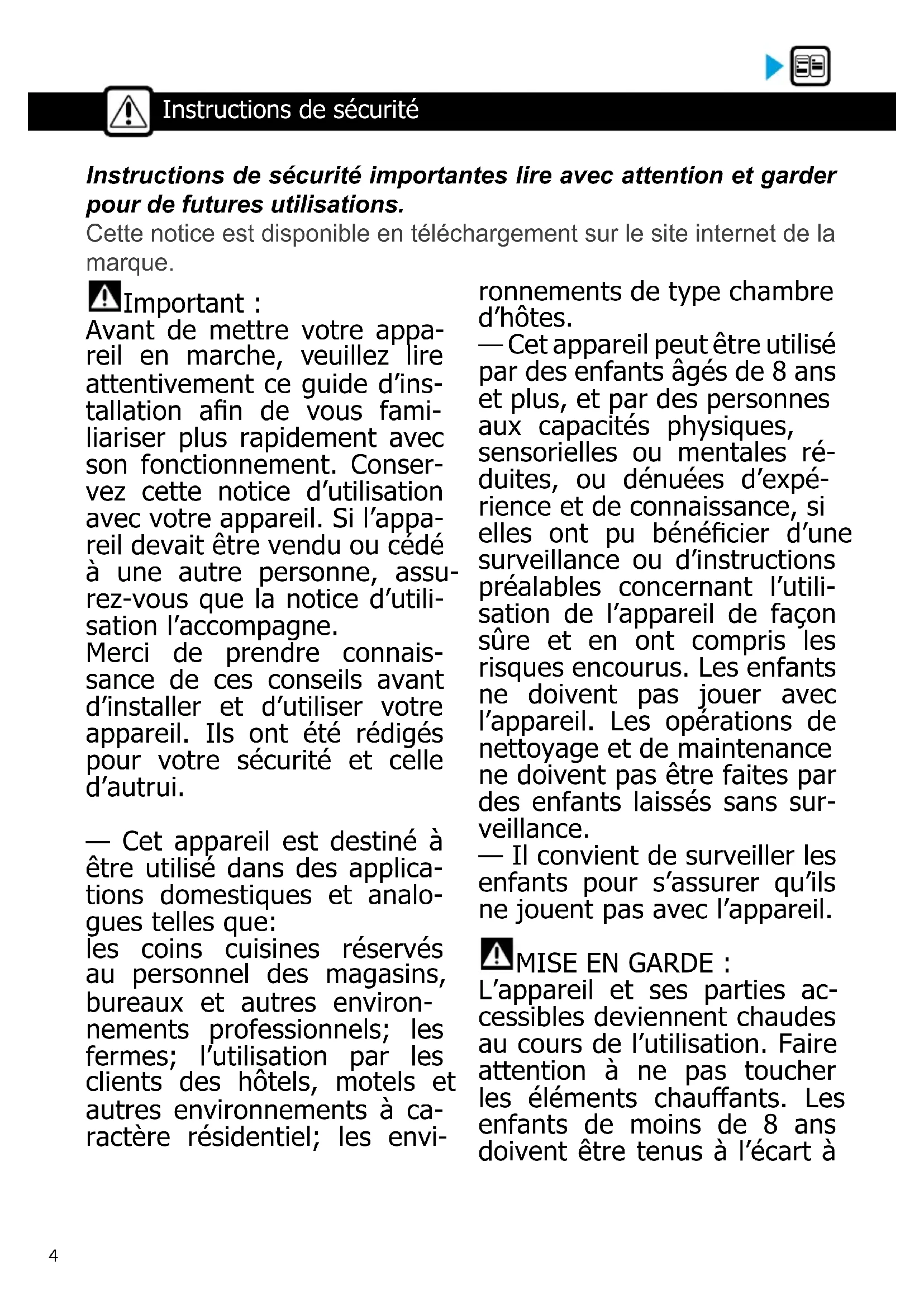 Essais d’aptitude a la fonction ....................................................... 194 Instructions de sécurité Important : Avant de mettre votre appa- reil en marche, veuillez lire attentivement ce guide d’ins- tallation an de vous fami- liariser plus rapidement avec son fonctionnement. Conser- vez cette notice d’utilisation avec votre appareil. Si l’appa- reil devait être vendu ou cédé à une autre personne, assu- rez-vous que la notice d’utili- sation l’accompagne. Merci de prendre connais- sance de ces conseils avant d’installer et d’utiliser votre appareil. Ils ont été rédigés pour votre sécurité et celle d’autrui. — Cet appareil est destiné à être utilisé dans des applica- tions domestiques et analo- gues telles que: les coins cuisines réservés au personnel des magasins, bureaux et autres environ- nements professionnels; les fermes; l’utilisation par les clients des hôtels, motels et autres environnements à ca- ractère résidentiel; les envi- ronnements de type chambre d’hôtes. — Cet appareil peut être utilisé par des enfants âgés de 8 ans et plus, et par des personnes aux capacités physiques, sensorielles ou mentales ré- duites, ou dénuées d’expé- rience et de connaissance, si elles ont pu bénécier d’une surveillance ou d’instructions préalables concernant l’utili- sation de l’appareil de façon sûre et en ont compris les risques encourus. Les enfants ne doivent pas jouer avec l’appareil. Les opérations de nettoyage et de maintenance ne doivent pas être faites par des enfants laissés sans sur- veillance. — Il convient de surveiller les enfants pour s’assurer qu’ils ne jouent pas avec l’appareil. MISE EN GARDE : L’appareil et ses parties ac- cessibles deviennent chaudes au cours de l’utilisation. Faire attention à ne pas toucher les éléments chauants. Les enfants de moins de 8 ans doivent être tenus à l’écart à Instructions de sécurité importantes lire avec attention et garder pour de futures utilisations. Cette notice est disponible en téléchargement sur le site internet de la marque.5 Instructions de sécurité Instructions de sécurité moins qu’ils ne soient surveil- lés en permanence. Il est dangereux pour qui- conque autre qu’une personne compétente d’eectuer des opérations de maintenance ou de réparation entraînant le retrait d’un couvercle qui pro- tège de l’exposition à l’éner- gie micro-ondes. Les liquides et autres ali- ments ne doivent pas être chaués dans des récipients fermés hermétiquement car ils risquent d’exploser. Si l’appareil fonctionne en mode combiné, il est recom- mandé que les enfants n’uti- lisent le four que sous la sur- veillance d’adultes en raison des températures générées. — Les récipients métalliques pour aliments et boissons ne sont pas admis lors de la cuis- son par micro-ondes. — Veiller à ne pas déplacer le plateau rotatif lors du retrait des récipients de l'appareil. — N’utiliser que des ustensiles appropriés à l’usage dans les fours micro-ondes. — Pendant le chauage de denrées alimentaires dans des contenants en plastique ou en papier, gardez un œil sur le four en raison de la possibilité d’inammation. — Si de la fumée apparaît, ar- rêtez ou débranchez le four et gardez la porte fermée pour étouer les ammes éven- tuelles. — Le chauage des boissons par micro-ondes peut provo- quer un jaillissement brusque et diéré de liquide en ébul- lition, pour cette raison des précautions doivent elles être prises lors de la manipulation du récipient. — Le contenu des biberons et des pots d’aliments pour bébé doit être remué ou agité et la température doit en être véri- ée avant consommation, de façon à éviter les brûlures. — Il n’est pas recommandé de chauer les œufs dans leur co- quille et les œufs durs entiers dans un four micro-ondes car ils risquent d’exploser, même après la n de cuisson. — Cet appareil est conçu pour faire des cuissons porte fer- mée. — Le four à micro-ondes est prévu pour chauer des den- rées alimentaires et des bois- sons. Le séchage de denrées ali- mentaires ou de linge et le chauage de coussins chauf- fants, pantoues, éponges,Environement et économie d'énergie Environement et économie d'énergie