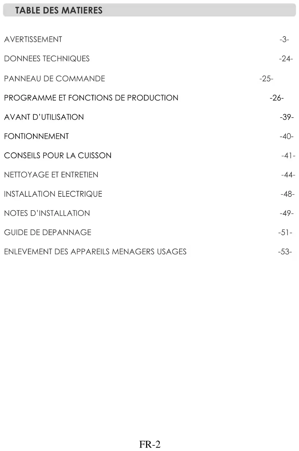 IMPORTANT: Si votre appareil ne fonctionne pas correctement, veuillez contacter votre revendeur. NE PAS ESSAYER DE REPARER L’APPAREIL PAR VOUS- MÊME Le fabriquant et le revendeur ne peuvent pas être tenus responsable de tout accident ou dommage causé par une utilisation impropre de l’appareil, ou si les instructions données dans le présent manuel n’ont pas été respectées.FR-52 Informations concernant les fours domestiques
