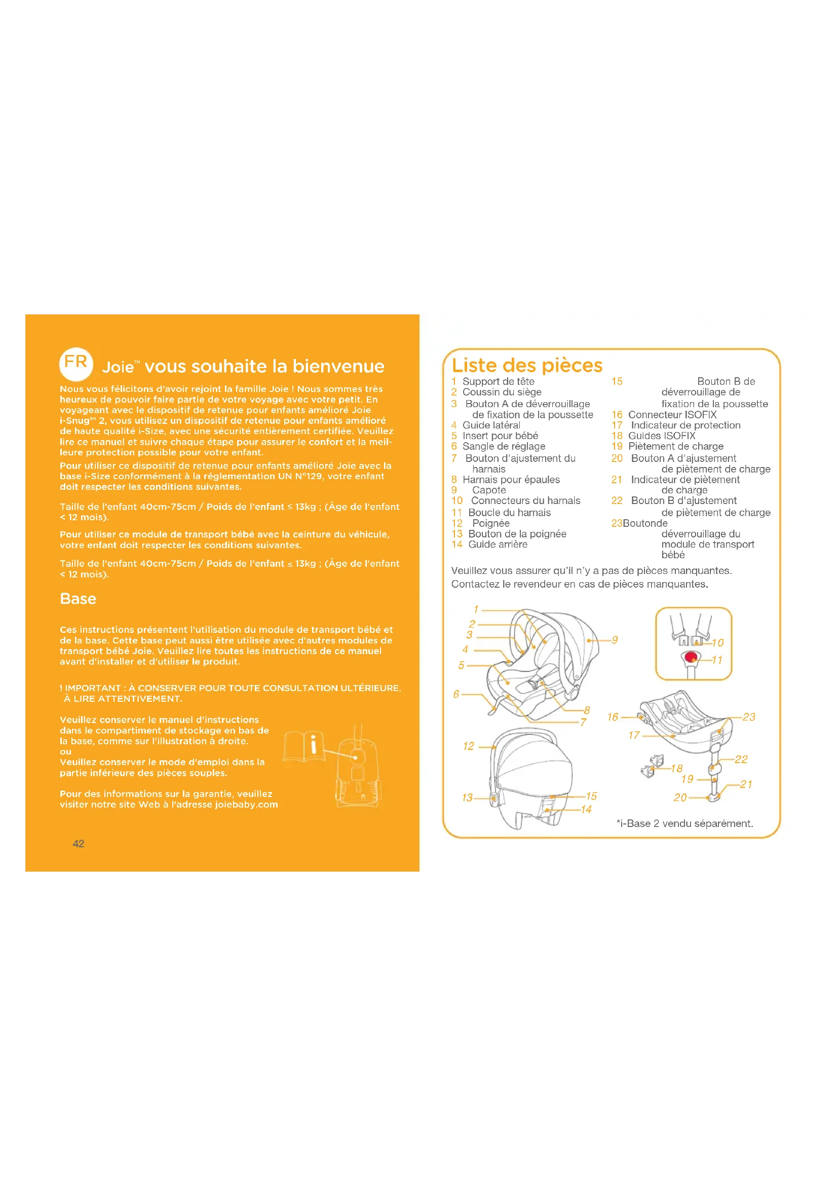 vous souhaite la bienvenue Nous vous félicitons d’avoir rejoint la famille Joie ! Nous sommes très heureux de pouvoir faire partie de votre voyage avec votre petit. En voyageant avec le dispositif de retenue pour enfants amélioré Joie i-Snug™ 2, vous utilisez un dispositif de retenue pour enfants amélioré de haute qualité i-Size, avec une sécurité entièrement certifiée. Veuillez lire ce manuel et suivre chaque étape pour assurer le confort et la meil-leure protection possible pour votre enfant.Pour utiliser ce dispositif de retenue pour enfants amélioré Joie avec la base i-Size conformément à la réglementation UN N°129, votre enfant doit respecter les conditions suivantes.Taille de l’enfant 40cm-75cm / Poids de l’enfant ≤ 13kg ; (Âge de l’enfant < 12 mois).Pour utiliser ce module de transport bébé avec la ceinture du véhicule, votre enfant doit respecter les conditions suivantes.Taille de l’enfant 40cm-75cm / Poids de l’enfant ≤ 13kg ; (Âge de l’enfant < 12 mois). Base Ces instructions présentent l'utilisation du module de transport bébé et de la base. Cette base peut aussi être utilisée avec d'autres modules de transport bébé Joie. Veuillez lire toutes les instructions de ce manuel avant d'installer et d'utiliser le produit.! IMPORTANT : À CONSERVER POUR TOUTE CONSULTATION ULTÉRIEURE.À LIRE ATTENTIVEMENT.Veuillez conserver le manuel d'instructions dans le compartiment de stockage en bas de la base, comme sur l'illustration à droite. Veuillez conserver le mode d'emploi dans la partie inférieure des pièces souples.Pour des informations sur la garantie, veuillez visiter notre site Web à l'adresse joiebaby.com