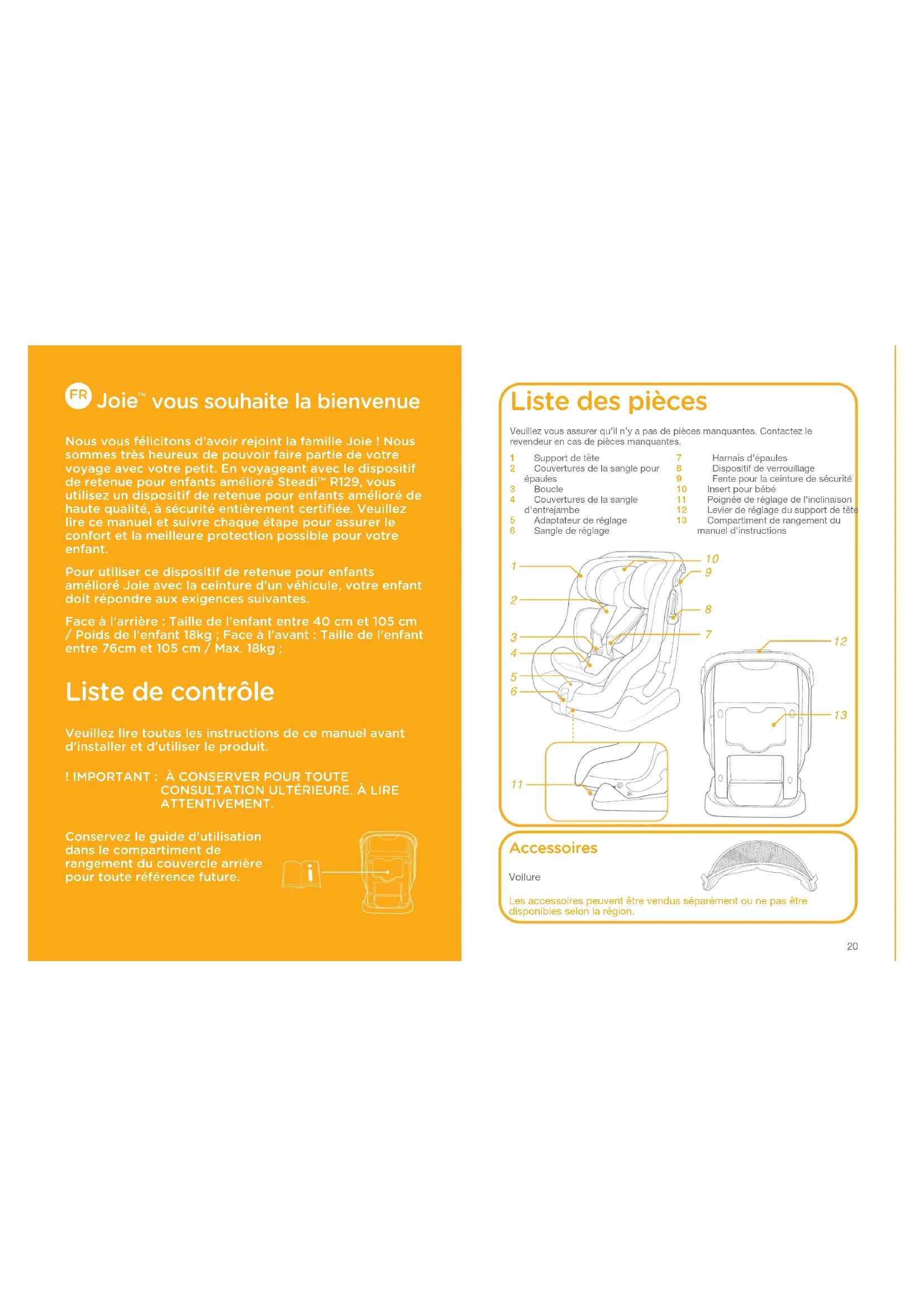 vous souhaite la bienvenue Nous vous félicitons d’avoir rejoint la famille Joie ! Nous sommes très heureux de pouvoir faire partie de votre voyage avec votre petit. En voyageant avec le dispositif de retenue pour enfants amélioré Steadi™ R129, vous utilisez un dispositif de retenue pour enfants amélioré de haute qualité, à sécurité entièrement certifiée. Veuillez lire ce manuel et suivre chaque étape pour assurer le confort et la meilleure protection possible pour votre enfant.Pour utiliser ce dispositif de retenue pour enfants amélioré Joie avec la ceinture d’un véhicule, votre enfant doit répondre aux exigences suivantes.Face à l'arrière : Taille de l'enfant entre 40 cm et 105 cm / Poids de l'enfant 18kg ; Face à l’avant : Taille de l'enfant entre 76cm et 105 cm / Max. 18kg ; Liste de contrôle Veuillez lire toutes les instructions de ce manuel avant d'installer et d'utiliser le produit.! IMPORTANT : À CONSERVER POUR TOUTE CONSULTATION ULTÉRIEURE. À LIRE ATTENTIVEMENT.Conservez le guide d’utilisation dans le compartiment de rangement du couvercle arrière pour toute référence future.