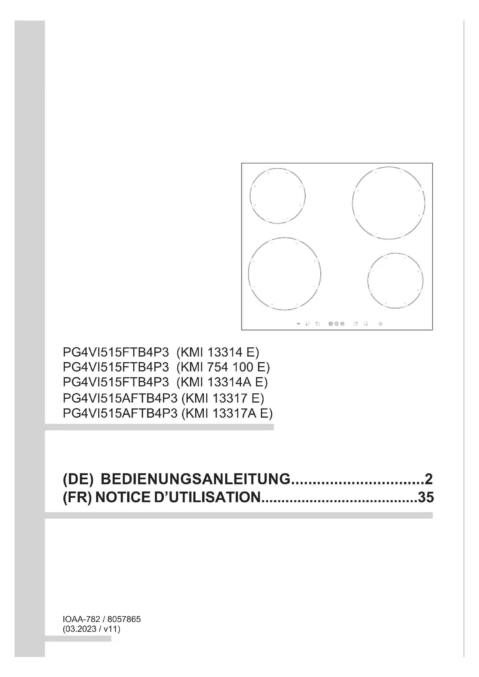 niert nicht, die Kochzonen können nicht eingeschaltet oder bedient werden. - Fehler der Elektronik - Das Kochfeld neu star- ten, für 60 Sekunden vom Stromnetz trennen (Siche- rung herausnehmen).34 TECHNISCHE DATEN Nennspannung 230/400V 2N~50 Hz Nennleistung der Kochfelder: 7,4 kW 7,4 kW Model: KMI* KMI* PG4VI515FTB4P3 PG4VI515AFTB4P3 - Induktionskochzone : - Induktionskochzone : Ø 160 mm 1200 W 1200 W - Induktionskochzone : Ø 210 mm 2000 W 2000 W - Induktionskochzone Booster: Ø 210 mm 2000/3000 W 2000/3000 W - Induktionskochzone Booster: Ø 160 mm 1200/1400 W 1200/1400 W Abmessungen 576 x 518 x 59 ; 770 x 518 x 59; Gewicht ca.10,5 kg; ca.15 kg; Erfüllt die Anforderungen der Normen EN 60335-1; EN 60335-2-6, die in der Europäischen Union gelten.35 CHER CLIENT, La plaque, c’est une facilité d’utilisation exceptionnelle et une ecacité parfaite. Après avoir lu le mode d’emploi, l’utilisation de la plaque ne présentera aucun problème. En sortie d’usine, avant son emballage, la plaque a été scrupuleusement vériée par rapport à la sécurité et à la fonctionnalité. Prière de lire attentivement le mode d’emploi avant la mise en fonctionnement de l’appareil. Respecter ses indications vous protégera contre toute utilisation incorrecte. Garder le mode d’emploi dans un endroit accessible. Respecter les instructions de ce mode d’emploi an d’éviter des accidents.