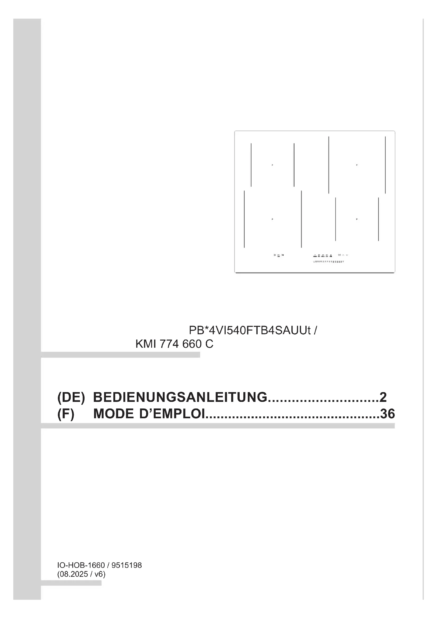 Leistung der Induktionskochzonen: 7,35 kW - Induktionskochzone : - Induktionskochzone : Ø Ø 160 mm 1400W - Induktionskochzone : Ø Ø 210 mm 2000W - Induktionskochzone Booster: Ø Ø 160 mm 2100W - Induktionskochzone Booster: Ø Ø 180 mm 2500W - Induktionskochzone Booster: Ø Ø 210 mm 3000W Maße [mm]: 592 x 522 x 48 Gewicht [kg]: ca. 7,85 Leistungsaufnahme im Standby-Modus [W] - Leistungsaufnahme im Aus-Zustand [W] 0,5 Leistungsaufnahme im Standby-Modus bei Netzanschluss [W] - Zeit bis zum automatischen Umschalten in den Standby-Modus/Aus-Zustand [min] 136 CHER CLIENT, La plaque, c’est une facilité d’utilisation exceptionnelle et une ecacité parfaite. Après avoir lu le mode d’emploi, l’utilisation de la plaque ne présentera aucun problème. En sortie d’usine, avant son emballage, la plaque a été scrupuleusement vériée par rapport à la sécurité et à la fonctionnalité. Prière de lire attentivement le mode d’emploi avant la mise en fonctionnement de l’appareil. Respecter ses indications vous protégera contre toute utilisation incorrecte. Garder le mode d’emploi dans un endroit accessible. Respecter les instructions de ce mode d’emploi an d’éviter des accidents.