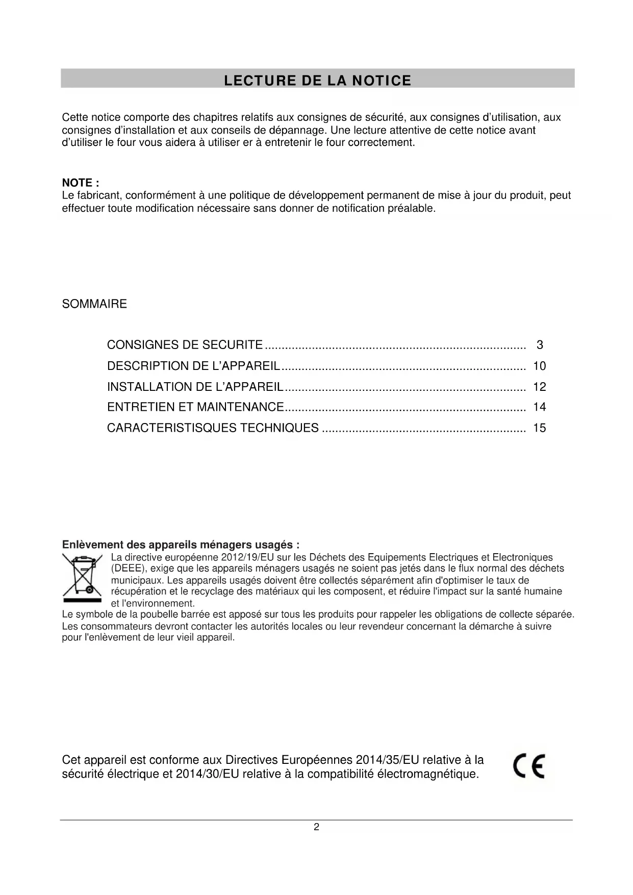 Cette notice comporte des chapitres relatifs aux consignes de sécurité, aux consignes d’utilisation, aux consignes d’installation et aux conseils de dépannage. Une lecture attentive de cette notice avant d’utiliser le four vous aidera à utiliser er à entretenir le four correctement.