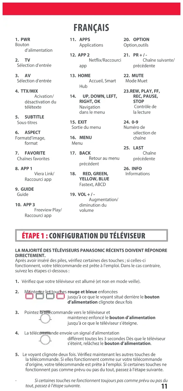 CERTAINES TOUCHES NE FONCTIONNENT-ELLES PAS COMME PRÉVU?Si certaines touches ne fonctionnent pas comme prévu ou pas du tout, passez à l’étape suivante.1. Vériez que votre téléviseur est allumé (et non en mode veille).2. Maintenez les touches rouge et bleue enfoncées jusqu’à ce que le voyant situé derrière le bouton d’alimentation clignote deux fois3. Pointez la télécommande vers le téléviseur et main tenez enfoncée l’une des touches ne fonctionnant pas correctement (par exemple, Menu). 4. La télécommande envoie un signal toutes les 3secondes.5. Lorsque la fonction correcte s’ache à l’écran (dans ce cas, Menu), relâchez la touche.6. Le voyant clignote deux fois lorsque la télécommande peut être utilisée. ÉTAPE2: DANS LE CAS OÙ L’ÉTAPE1 NE