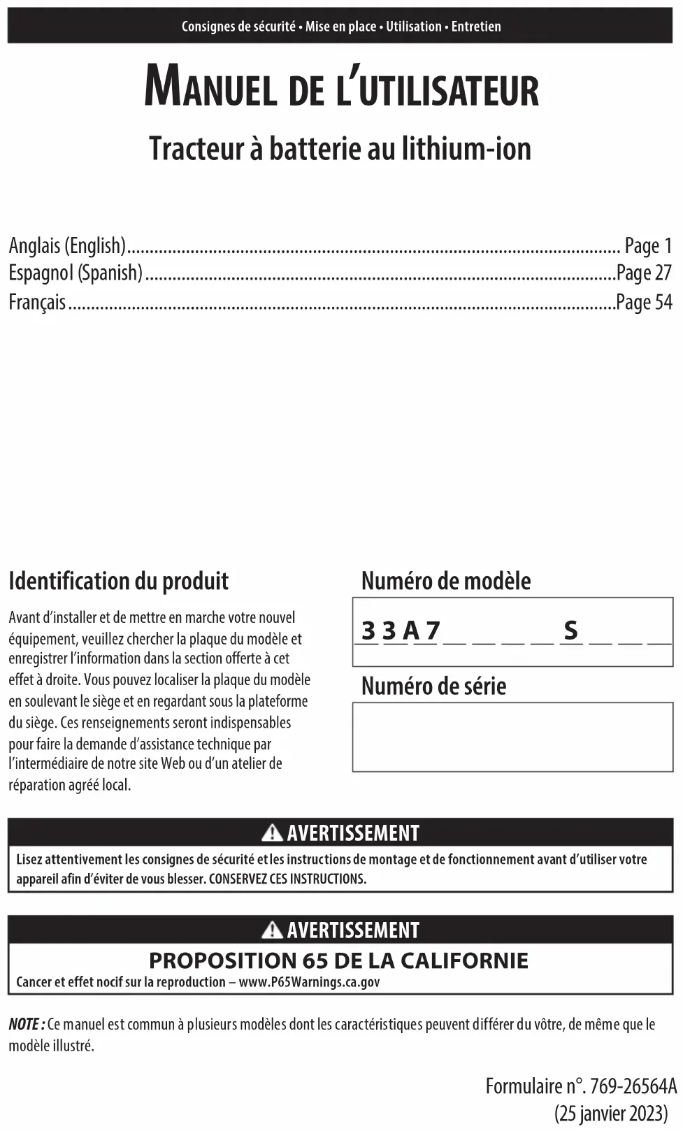 Numéro de série Anglais (English) ............................................................................................................. Page 1 Espagnol (Spanish) ........................................................................................................Page 27 Français .........................................................................................................................Page 54 AVERTISSEMENT Lisez attentivement les consignes de sécurité et les instructions de montage et de fonctionnement avant d’utiliser votre appareil afin d’éviter de vous blesser. CONSERVEZ CES INSTRUCTIONS. AVERTISSEMENT