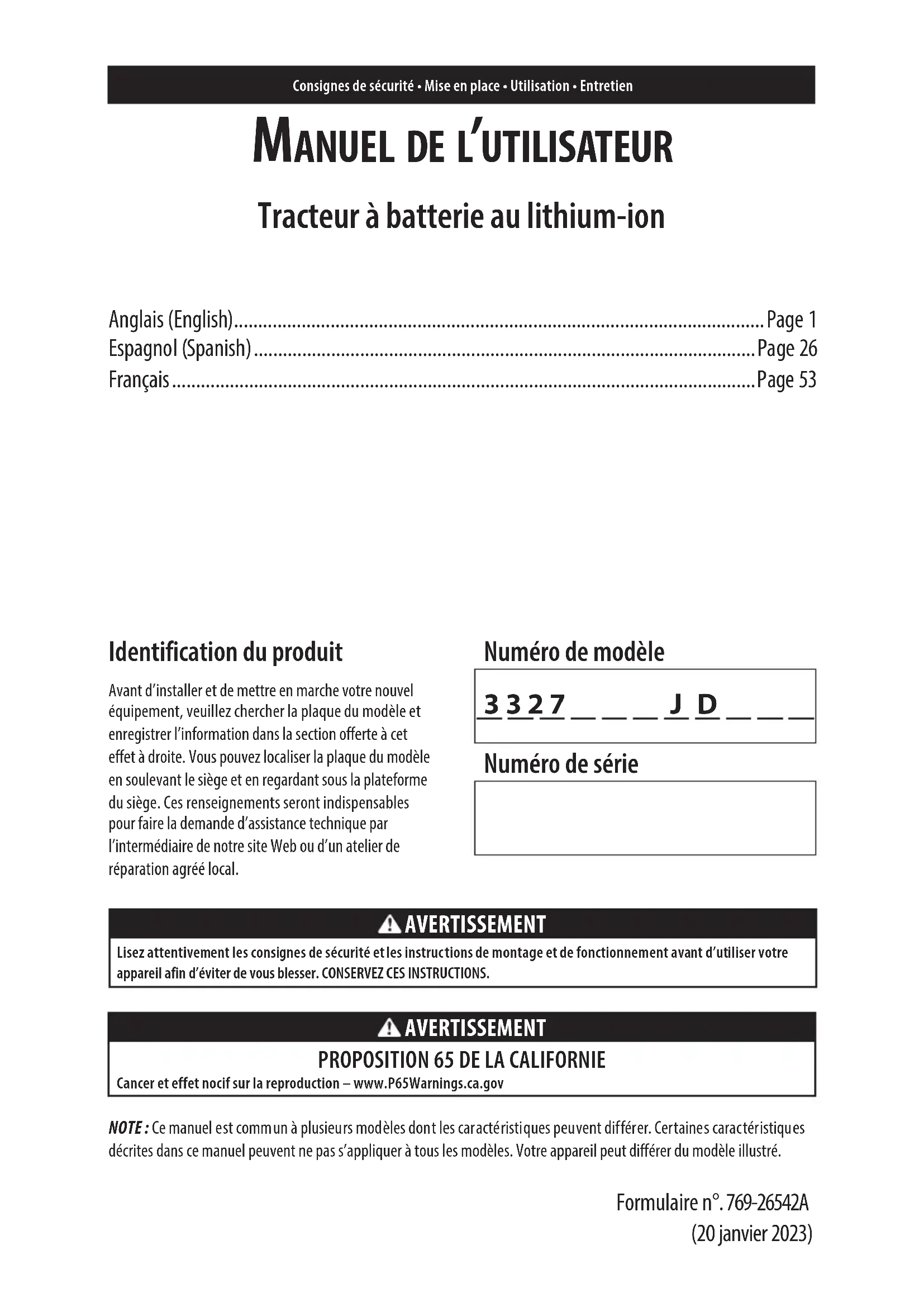 J D Numéro de série Anglais (English) ..............................................................................................................Page 1 Espagnol (Spanish) ........................................................................................................ Page 26 Français ......................................................................................................................... Page 53 Formulaire n°. 769-26542A (20 janvier 2023) AVERTISSEMENT Lisez attentivement les consignes de sécurité et les instructions de montage et de fonctionnement avant d’utiliser votre appareil afin d’éviter de vous blesser. CONSERVEZ CES INSTRUCTIONS. NOTE : Ce manuel est commun à plusieurs modèles dont les caractéristiques peuvent différer. Certaines caractéristiques décrites dans ce manuel peuvent ne pas s’appliquer à tous les modèles. Votre appareil peut différer du modèle illustré. AVERTISSEMENT