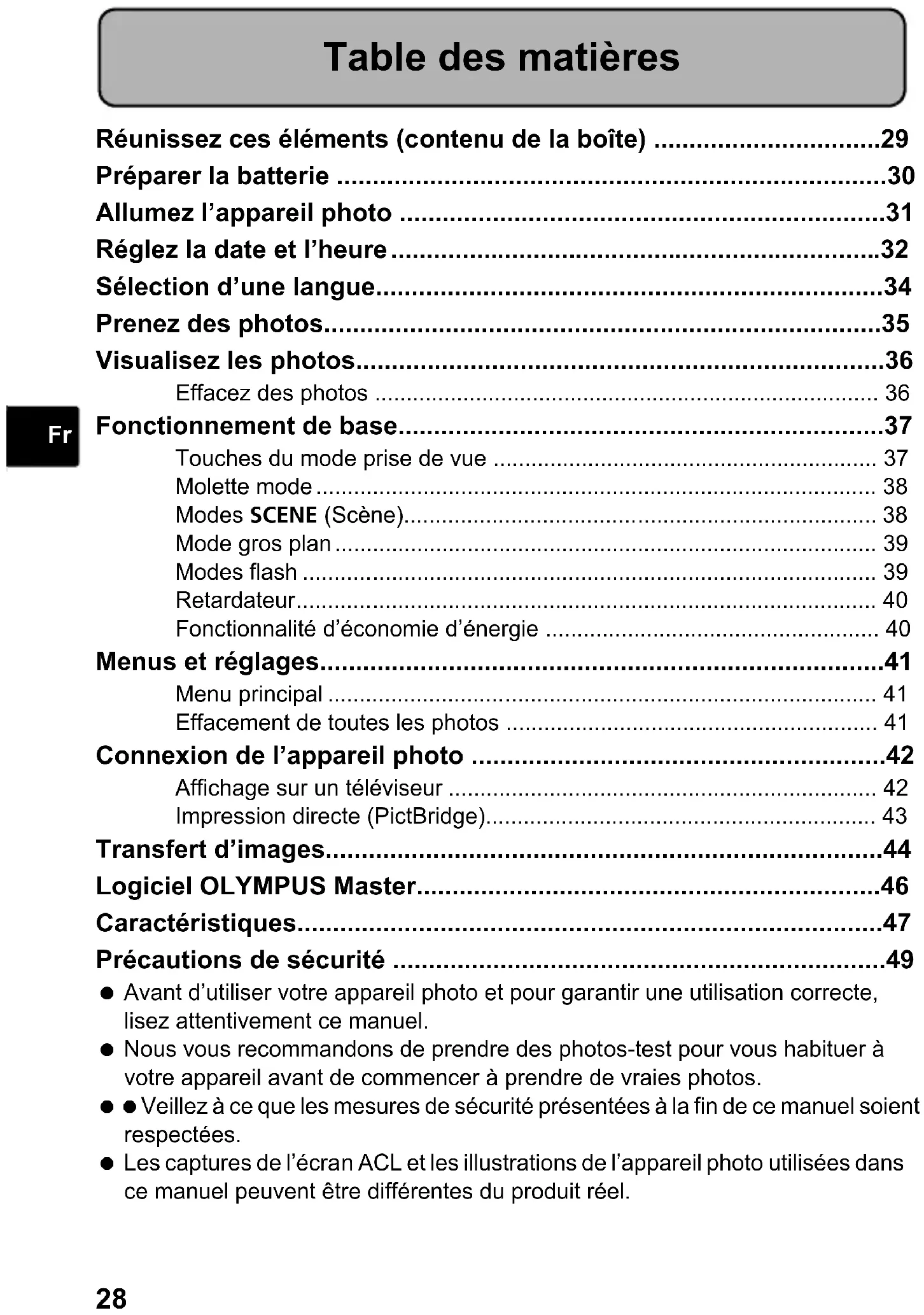 - Précautions de sécurité Avant d’utiliser votre appareil photo et pour garantir une utilisation correcte, lisez attentivement ce manuel. Nous vous recommandons de prendre des photos-test pour vous habituer à votre appareil avant de commencer à prendre de vraies photos. Veillez à ce que les mesures de sécurité présentées à la fin de ce manuel soient respectées. Les captures de l’écran ACL et les illustrations de l’appareil photo utilisées dans ce manuel peuvent être différentes du produit réel. Table des matières d4337_oai_f_basic_00_bookfile.book Page 28 Wednesday, November 29, 2006 9:15 AM29 p. 49