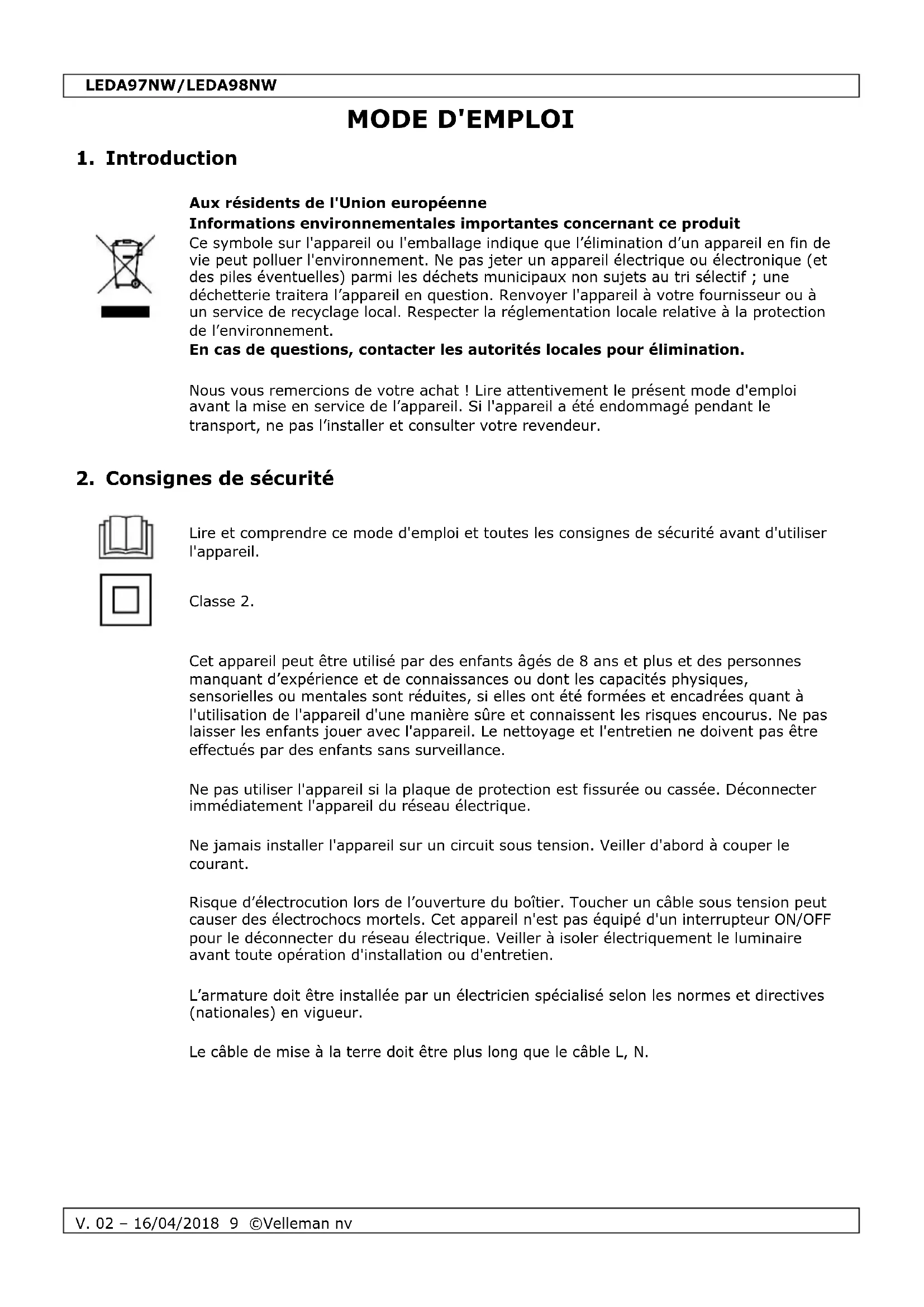 Velleman SA est l’ayant droit des droits d’auteur de ce mode d'emploi. Tous droits mondiaux réservés. Toute reproduction, traduction, copie ou diffusion, intégrale ou partielle, du contenu de ce mode d'emploi par quelque procédé ou sur tout support électronique que ce soit est interdite sans l’accord préalable écrit de l’ayant droit.LEDA97NW/LEDA98NW