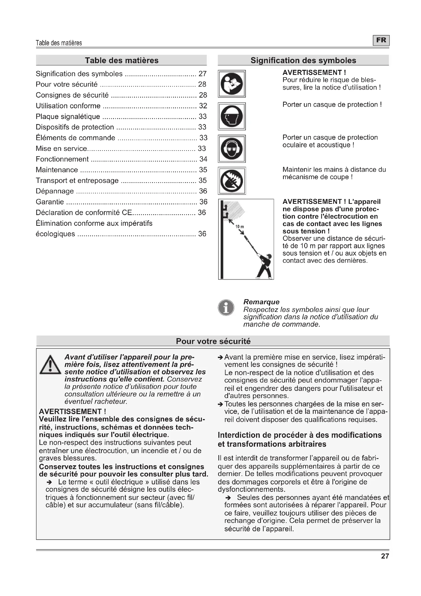 - Élimination conforme aux impératifs écologiques Signication des symboles AVERTISSEMENT ! Pour réduire le risque de bles- sures, lire la notice d'utilisation ! Porter un casque de protection ! Porter un casque de protection oculaire et acoustique ! Maintenir les mains à distance du mécanisme de coupe ! AVERTISSEMENT ! L'appareil ne dispose pas d'une protec- tion contre l'électrocution en cas de contact avec les lignes sous tension ! Observer une distance de sécuri- té de 10 m par rapport aux lignes sous tension et / ou aux objets en contact avec des dernières. Remarque Respectez les symboles ainsi que leur signication dans la notice d'utilisation du manche de commande. Pour votre sécurité Avant d'utiliser l'appareil pour la pre- mière fois, lisez attentivement la pré- sente notice d'utilisation et observez les instructions qu'elle contient. Conservez la présente notice d’utilisation pour toute consultation ultérieure ou la remettre à un éventuel racheteur. AVERTISSEMENT ! Veuillez lire l'ensemble des consignes de sécu- rité, instructions, schémas et données tech- niques indiqués sur l'outil électrique. Le non-respect des instructions suivantes peut entraîner une électrocution, un incendie et / ou de graves blessures. Conservez toutes les instructions et consignes de sécurité pour pouvoir les consulter plus tard. Î Le terme « outil électrique » utilisé dans les consignes de sécurité désigne les outils élec- triques à fonctionnement sur secteur (avec l/ câble) et sur accumulateur (sans l/câble). Î Avant la première mise en service, lisez impérati- vement les consignes de sécurité ! Le non-respect de la notice d'utilisation et des consignes de sécurité peut endommager l'appa- reil et engendrer des dangers pour l'utilisateur et d'autres personnes. Î Toutes les personnes chargées de la mise en ser- vice, de l’utilisation et de la maintenance de l’appa- reil doivent disposer des qualications requises. Interdiction de procéder à des modifications et transformations arbitraires Il est interdit de transformer l’appareil ou de fabri- quer des appareils supplémentaires à partir de ce dernier. De telles modications peuvent provoquer des dommages corporels et être à l'origine de dysfonctionnements. Î Seules des personnes ayant été mandatées et formées sont autorisées à réparer l'appareil. Pour ce faire, veuillez toujours utiliser des pièces de rechange d’origine. Cela permet de préserver la sécurité de l’appareil.Pour votre sécurité p. 36
