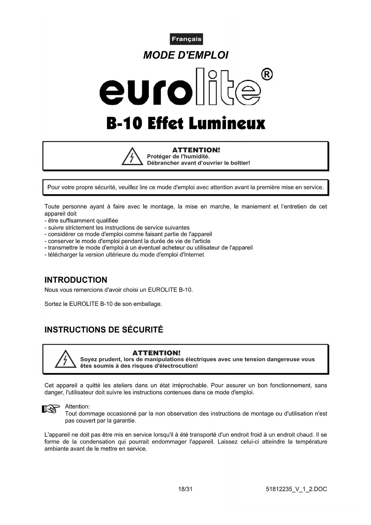 (steady state): 120° C Please note: Every information is subject to change without prior notice. 01.02.2007 ©51812235_V_1_2.DOC18/31 MODE D'EMPLOI B-10 Effet Lumineux ATTENTION! Protéger de l'humidité. Débrancher avant d’ouvrier le boîtier! Pour votre propre sécurité, veuillez lire ce mode d'emploi avec attention avant la première mise en service. Toute personne ayant à faire avec le montage, la mise en marche, le maniement et l’entretien de cet appareil doit- être suffisamment qualifiée- suivre strictement les instructions de service suivantes- considérer ce mode d'emploi comme faisant partie de l'appareil- conserver le mode d'emploi pendant la durée de vie de l'article- transmettre le mode d'emploi à un éventuel acheteur ou utilisateur de l'appareil- télécharger la version ultérieure du mode d'emploi d'Internet INTRODUCTION Nous vous remercions d'avoir choisi un EUROLITE B-10.Sortez le EUROLITE B-10 de son emballage.