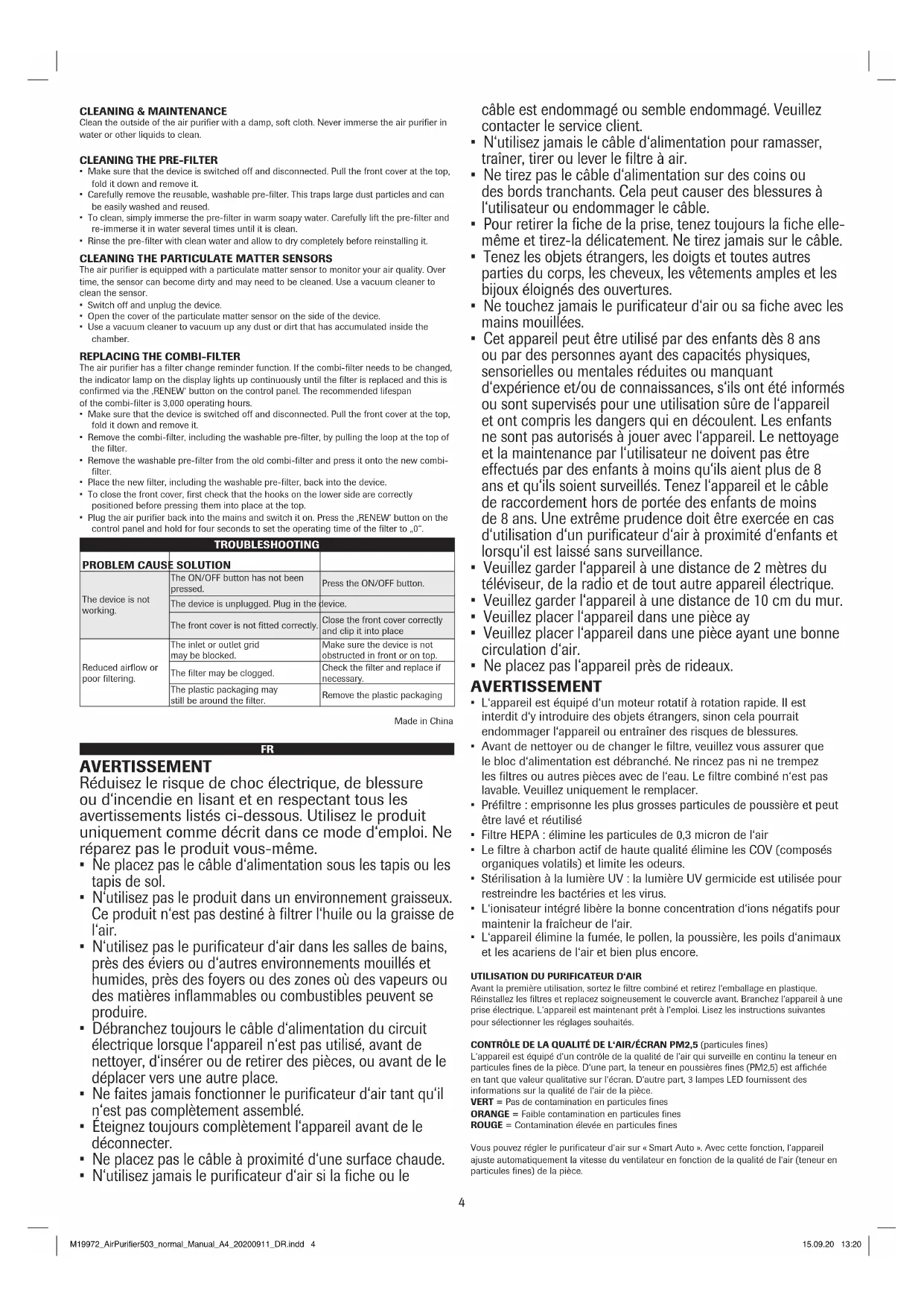 L‘appareil ne fonctionne pas. Le bouton MARCHE/ARRÊT n‘a pas été enfoncé. Appuyez sur le bouton MARCHE/ARRÊT. L‘appareil est débranché. Branchez l‘appareil. Le couvercle avant n‘est pas correctement inséré. Fermez le couvercle avant et enclenchez-le correctement Débit d‘air réduit ou mauvais filtrage. La grille d‘entrée ou de sortie est éventuellement bloquée. Assurez-vous que rien ne se trouve devant ou sur l‘appareil. Le filtre est peut-être obstrué. Vérifiez le filtre et remplacez-le si nécessaire. Les filtres peuvent encore être dans leur emballage plastique. Retirez l‘emballage plastique Fabriqué en Chine