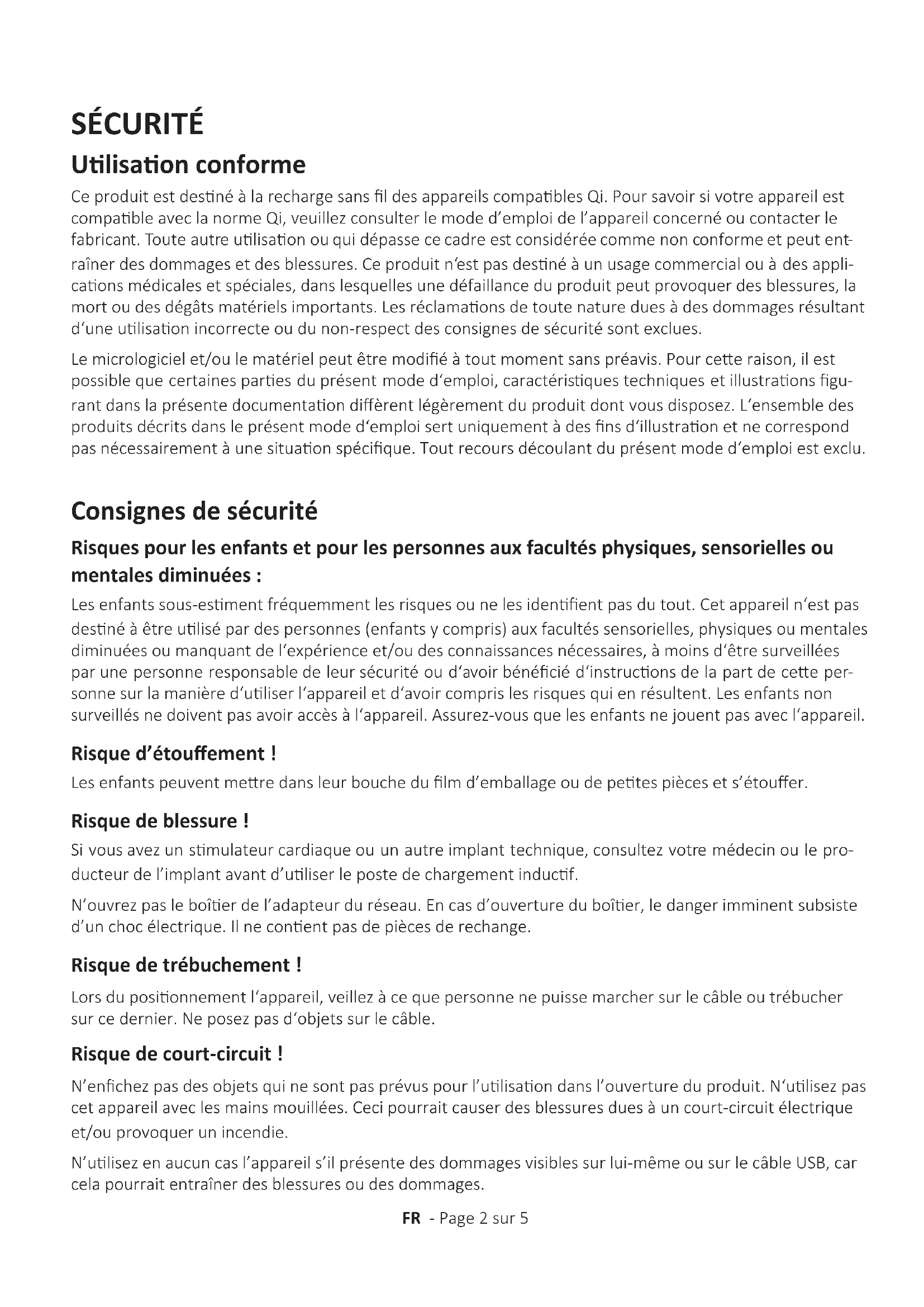 - Données techniques FR - Page 1 sur 5SÉCURITÉ Ulisaon conforme Ce produit est desné à la recharge sans l des appareils compables Qi. Pour savoir si votre appareil est compable avec la norme Qi, veuillez consulter le mode d’emploi de l’appareil concerné ou contacter le fabricant. Toute autre ulisaon ou qui dépasse ce cadre est considérée comme non conforme et peut ent- raîner des dommages et des blessures. Ce produit n‘est pas desné à un usage commercial ou à des appli- caons médicales et spéciales, dans lesquelles une défaillance du produit peut provoquer des blessures, la mort ou des dégâts matériels importants. Les réclamaons de toute nature dues à des dommages résultant d‘une ulisaon incorrecte ou du non-respect des consignes de sécurité sont exclues. Le micrologiciel et/ou le matériel peut être modié à tout moment sans préavis. Pour cee raison, il est possible que certaines pares du présent mode d‘emploi, caractérisques techniques et illustraons gu- rant dans la présente documentaon dièrent légèrement du produit dont vous disposez. L‘ensemble des produits décrits dans le présent mode d‘emploi sert uniquement à des ns d‘illustraon et ne correspond pas nécessairement à une situaon spécique. Tout recours découlant du présent mode d‘emploi est exclu. Consignes de sécurité Risques pour les enfants et pour les personnes aux facultés physiques, sensorielles ou mentales diminuées : Les enfants sous-esment fréquemment les risques ou ne les idenent pas du tout. Cet appareil n‘est pas desné à être ulisé par des personnes (enfants y compris) aux facultés sensorielles, physiques ou mentales diminuées ou manquant de l‘expérience et/ou des connaissances nécessaires, à moins d‘être surveillées par une personne responsable de leur sécurité ou d‘avoir bénécié d‘instrucons de la part de cee per- sonne sur la manière d‘uliser l‘appareil et d‘avoir compris les risques qui en résultent. Les enfants non surveillés ne doivent pas avoir accès à l‘appareil. Assurez-vous que les enfants ne jouent pas avec l‘appareil. Risque d’étouement ! Les enfants peuvent mere dans leur bouche du lm d’emballage ou de petes pièces et s’étouer. Risque de blessure ! Si vous avez un smulateur cardiaque ou un autre implant technique, consultez votre médecin ou le pro- ducteur de l’implant avant d’uliser le poste de chargement inducf. N’ouvrez pas le boîer de l’adapteur du réseau. En cas d’ouverture du boîer, le danger imminent subsiste d’un choc électrique. Il ne conent pas de pièces de rechange. Risque de trébuchement ! Lors du posionnement l‘appareil, veillez à ce que personne ne puisse marcher sur le câble ou trébucher sur ce dernier. Ne posez pas d‘objets sur le câble. Risque de court-circuit ! N’enchez pas des objets qui ne sont pas prévus pour l’ulisaon dans l’ouverture du produit. N‘ulisez pas cet appareil avec les mains mouillées. Ceci pourrait causer des blessures dues à un court-circuit électrique et/ou provoquer un incendie. N’ulisez en aucun cas l’appareil s’il présente des dommages visibles sur lui-même ou sur le câble USB, car cela pourrait entraîner des blessures ou des dommages. FR - Page 2 sur 5L’appareil ne doit pas être exposé à des éclaboussures ou à des goues d’eau. Les récipients remplis de liquide (vases, verres ou autres) ne doivent pas être placés sur l’appareil ou à proxi- mité immédiate de celui-ci. Le récipient risque de se renverser et le liquide de nuire à la sécurité électrique. L’appareil produit lors de l’ulisaon de la chaleur, ceci est normal. Pendant l’ulisaon ne recouvrez pas enèrement l’appareil pour éviter toute surchaue. Dommages ! Tenez l‘appareil à distance de toute humidité et évitez la poussière, la chaleur et l‘exposion directe à la lumière du soleil. N’ulisez pas d’eau ou de soluons chimiques pour neoyer l’appareil. Ulisez uniquement un chion sec. N‘ouvrez pas le boîer de l‘appareil et ne désassemblez pas l‘appareil. N‘essayez pas de le réparer par vos propres moyens. La garane deviendrait caduque dans ces cas. Évitez les chocs violents avec l’appareil. Exploitez l’adapteur du réseau seulement avec une prise de courant mise à terre avec AC 100- 240V~, 50/60 Hz. Si vous n’êtes pas sûr de l’alimentaon en courant au lieu d’emplacement, demandez-le au fournisseur d’énergie concerné. Pour interrompre l’alimentaon en courant vers votre appareil, rerez la pare de réseau de la prise du courant. Maintenez la pare de réseau toujours lors de l’extracon. Ne rez pas au câble. Déclaraon de conformité Le marquage CE indique que ce produit sasfait aux exigences de toutes les direcves UE appli- cables à ce produit. Cercat de conformité simplié Par la présente, Intenso Internaonal déclare que le type d’appareil radio Wireless Charger BA2 est confor- me à la direcve 2014/53/UE. Le texte complet de la déclaraon de conformité UE est disponible à l’adresse Internet suivante : www.intenso.eu. p. 5